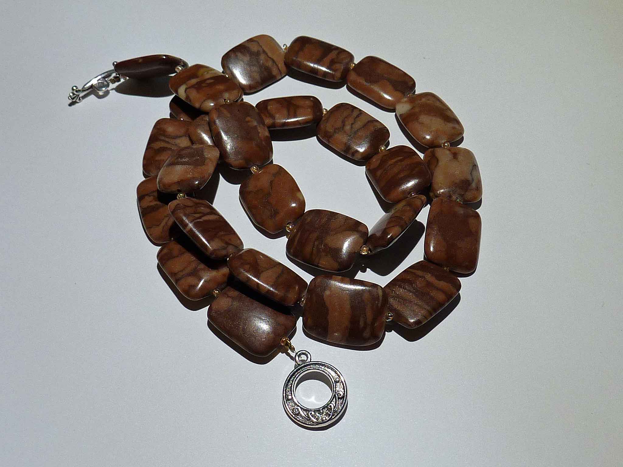 Description : Jolis rectangles de jaspe brun poli intercalés de petites perles de rocaille nacrées