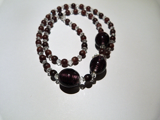 Description : Perles en cristal et en bois agrémentées de 3 grosses perles violettes avec feuille d'argent