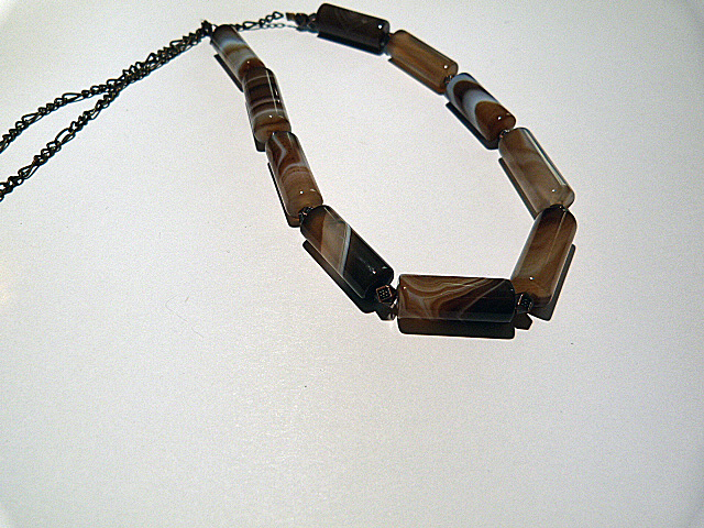 Description : Collier en tubes en jaspe brun intercalées de jolies perles fantaisie en métal cuivré puis terminé par une chaine