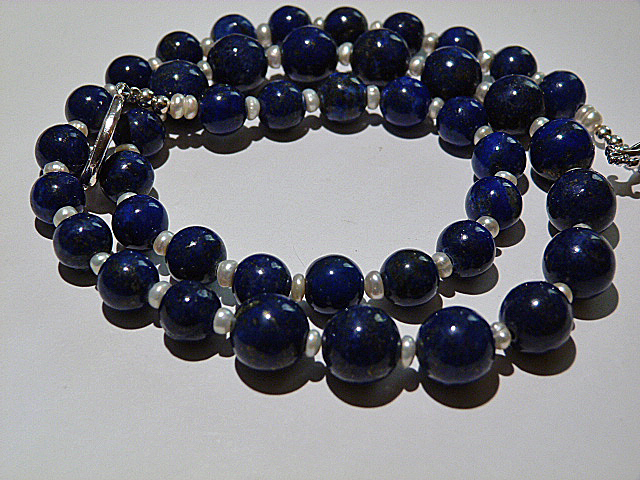 Description : Collier de forme classique aux perles en lapis lazuli intercalées de petites perles blanches