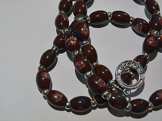 Description : Perles ovales en porcelaine aux motifs floraux intercalées de perles plates argent