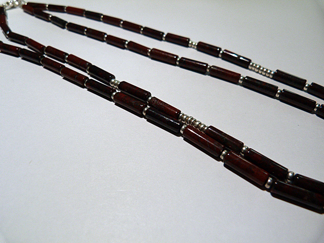 Description : Tubes de jaspe brun poli intercalés de perles argent
