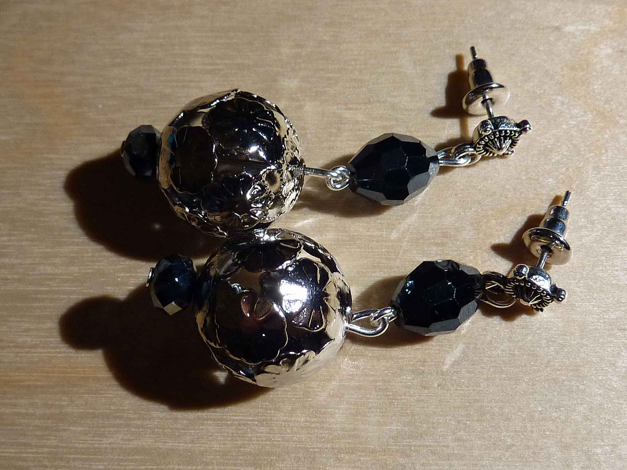 Description : Grosse perle ouvragée et une perle facettée swarowski noire sur une monture argentée