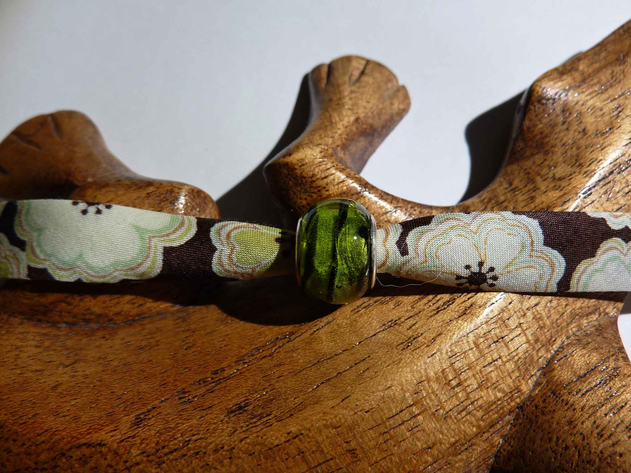 Description : En biais brun aux gros motifs floraux agrémenté d'une perle style pandora en verre murano olive et noir. Le fermoir est aimanté.