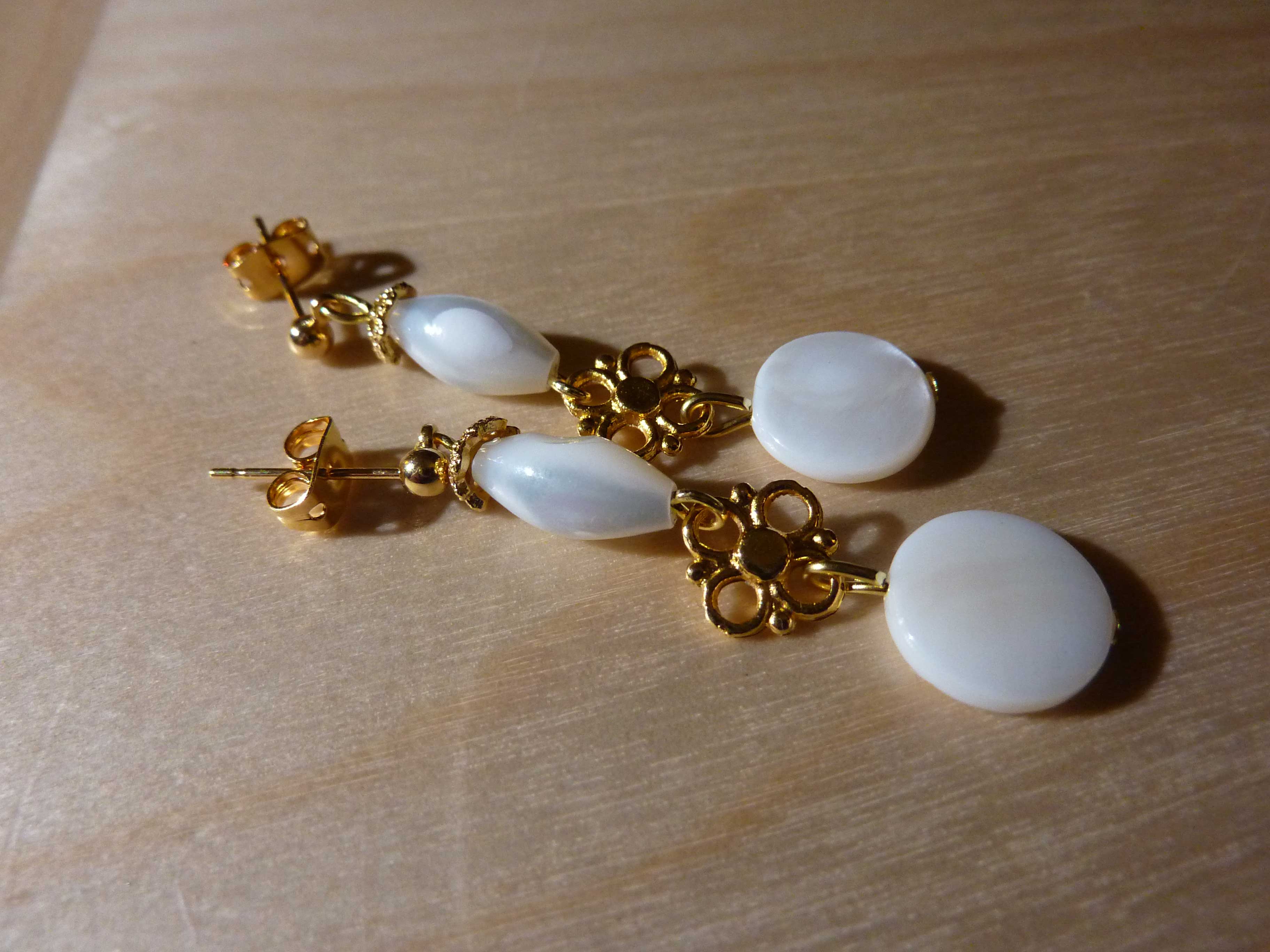 Description : Jolie boucle d'oreilles avec des perles en nacre véritable de formes différentes sur une monture dorée