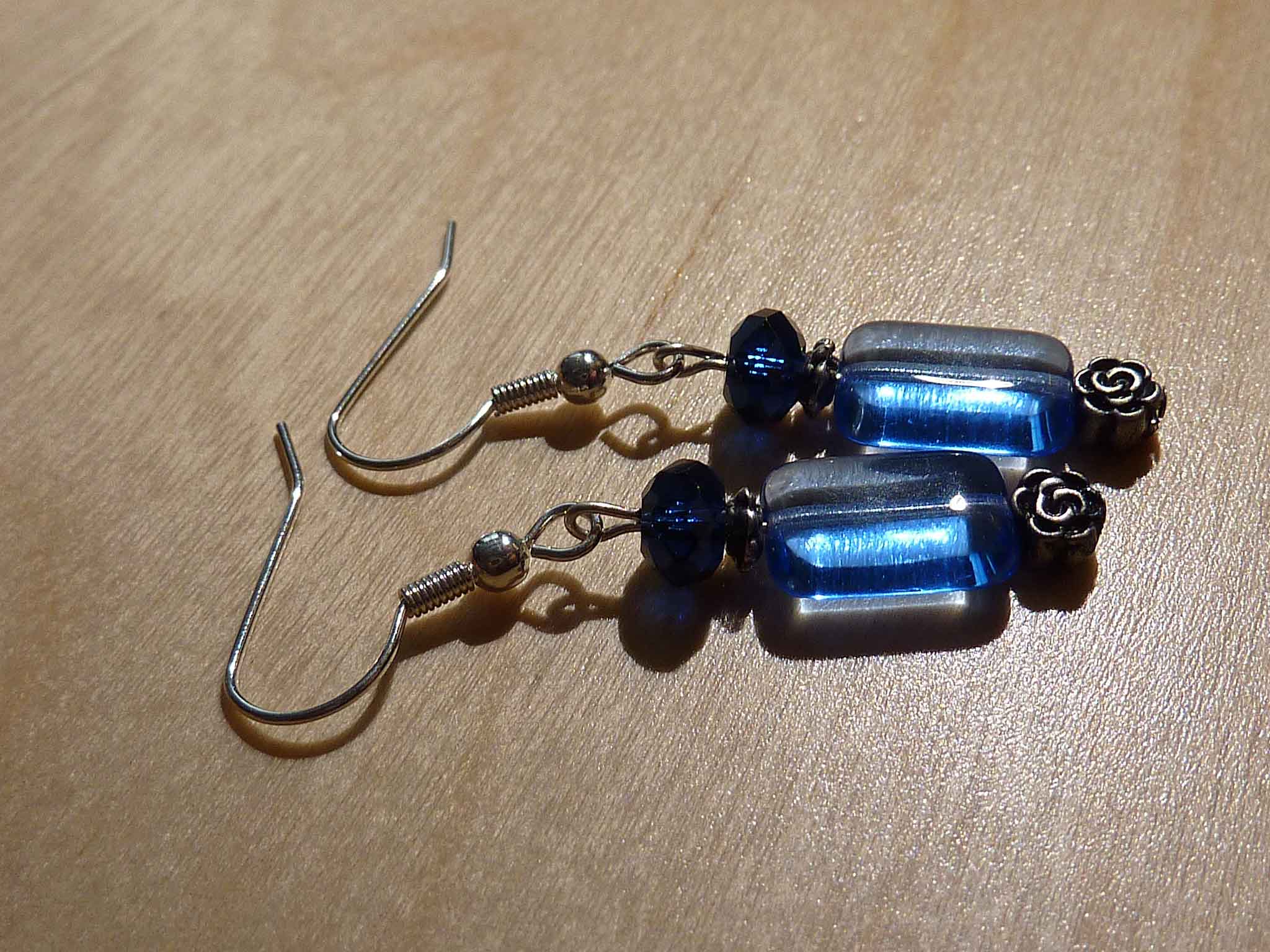 Description : Petite boucle toute simple en verre bleu avec une petite fleur en métal sur une monture argent