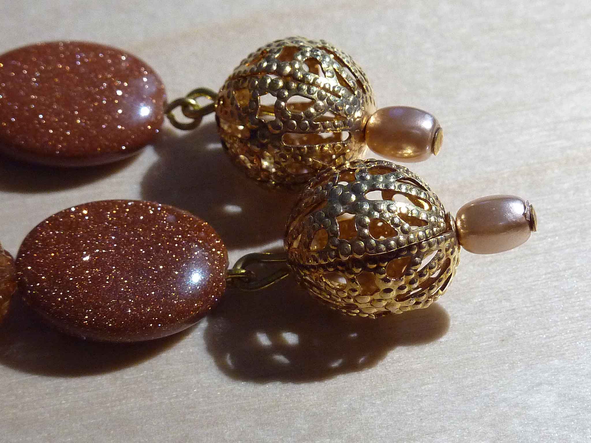Description : Un palet en goldstone tout scintillant agrémenté d'une perle en verre de bohème et d'une perle en filigrane sur une monture dorée
