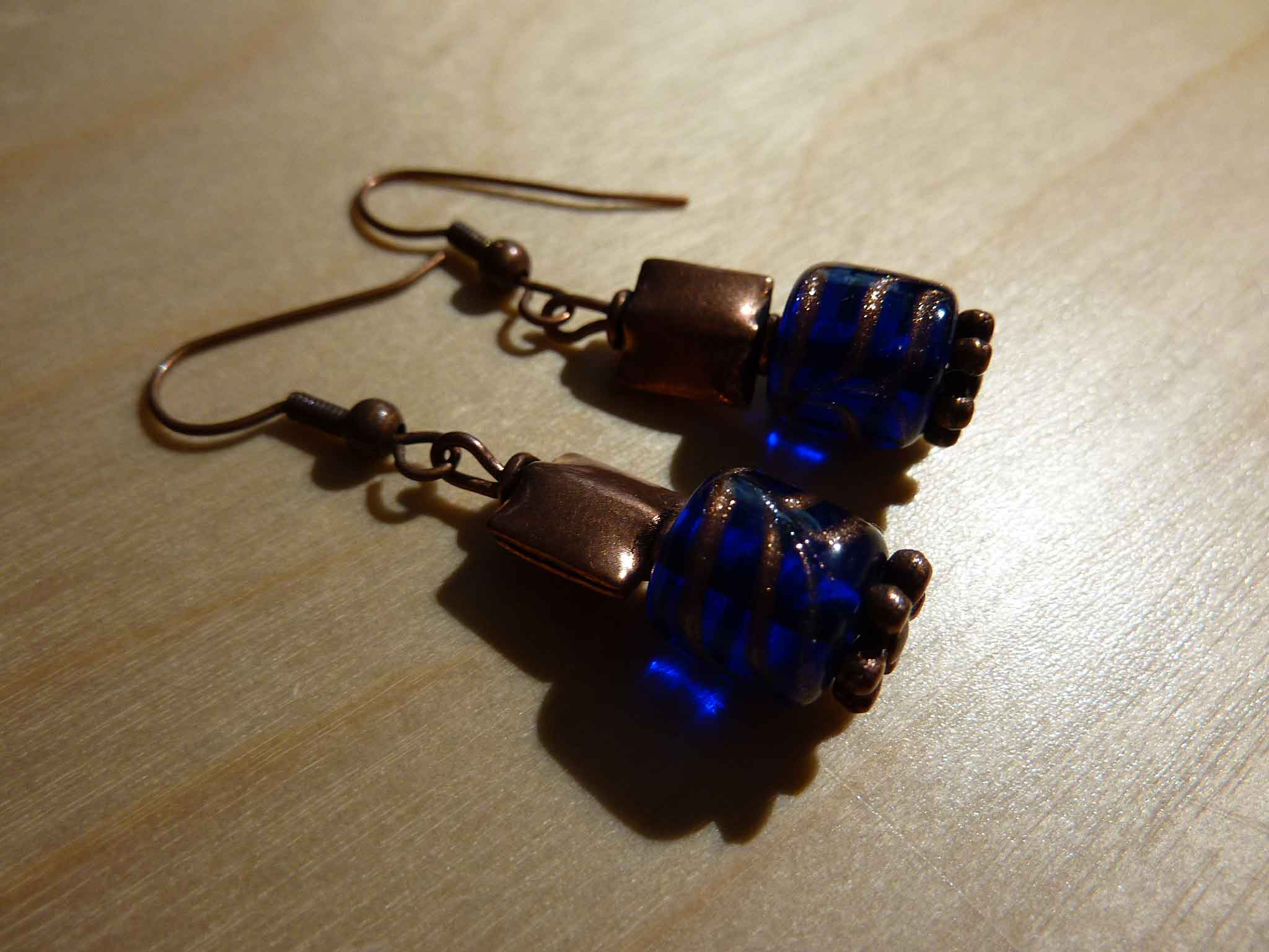 Description : Toute petite boucle avec une jolie perle en verre bleu nuit et un petit palet carré en métal cuivré