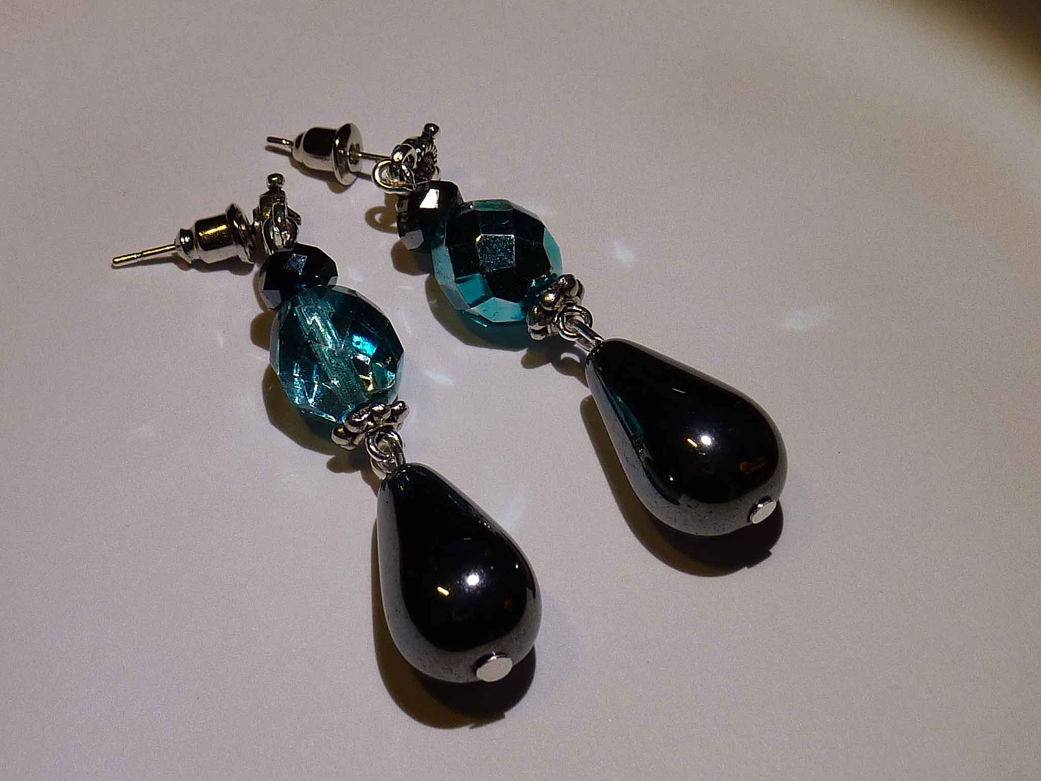 Description : Goutte aux effets métalliques avec une grosse perle à facettes en cristal de bohème turquoise sur monture argentée.
