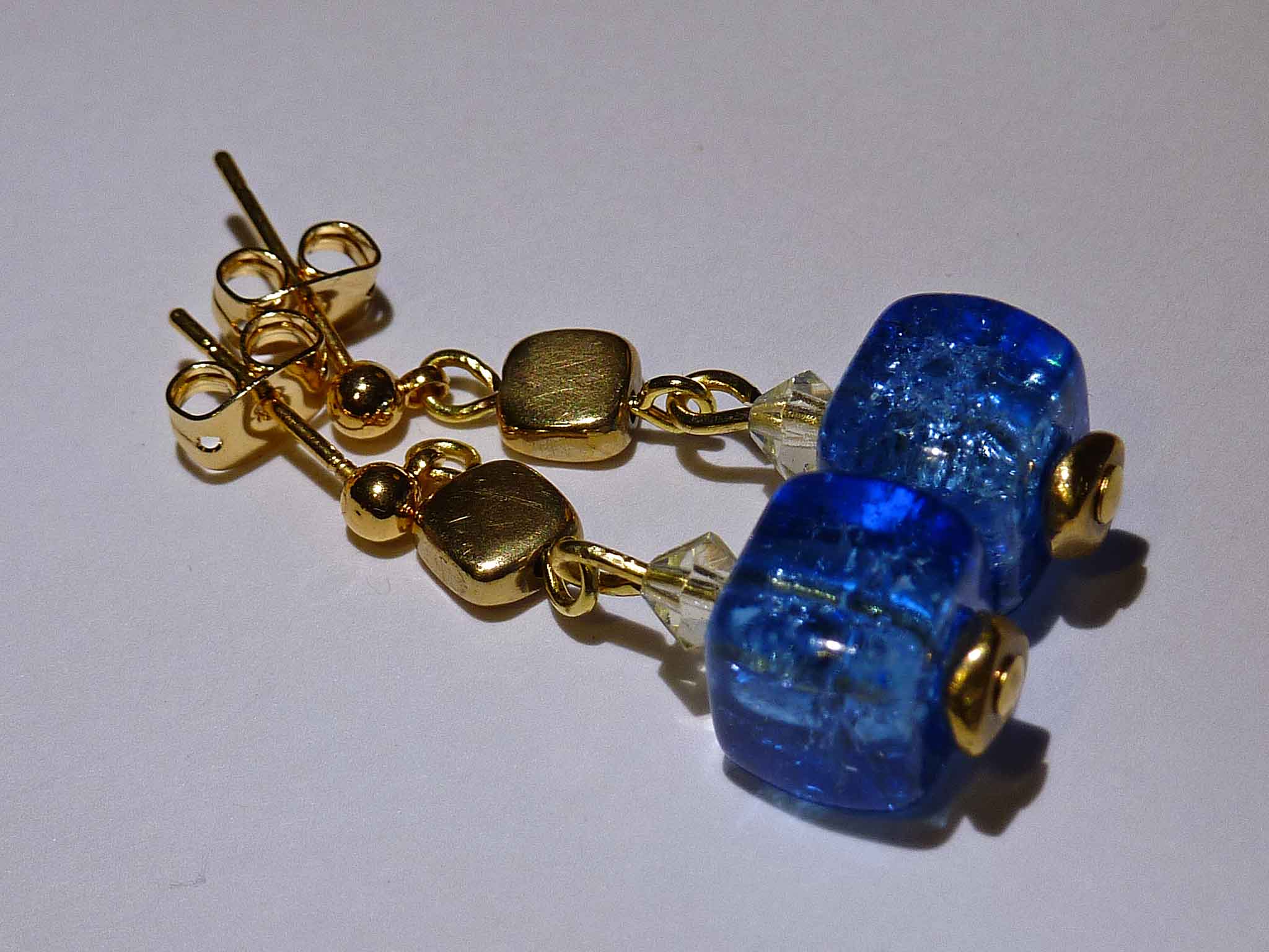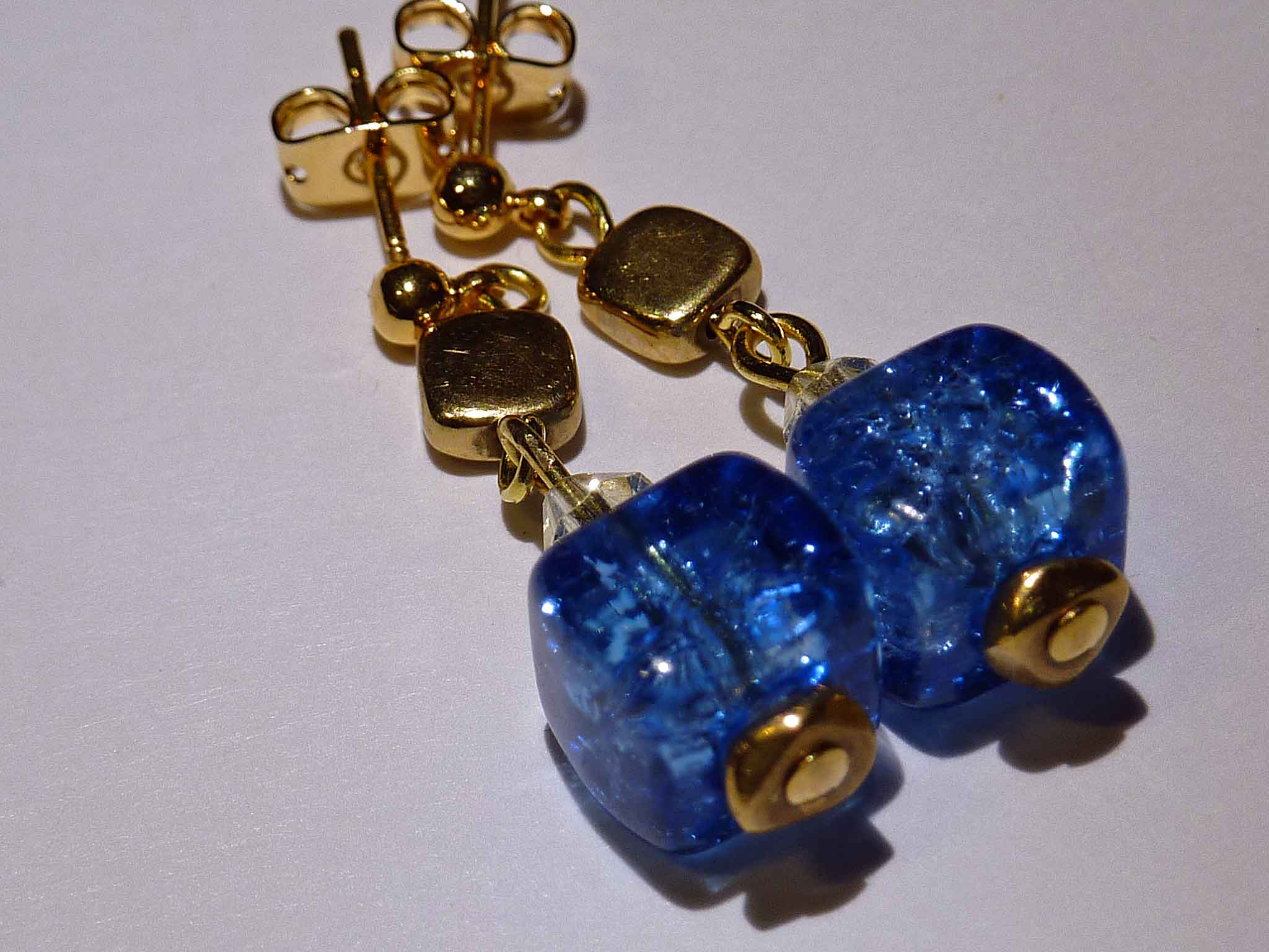 Description : Petite boucle avec un cube en verre craquelé bleu sur monture dorée.