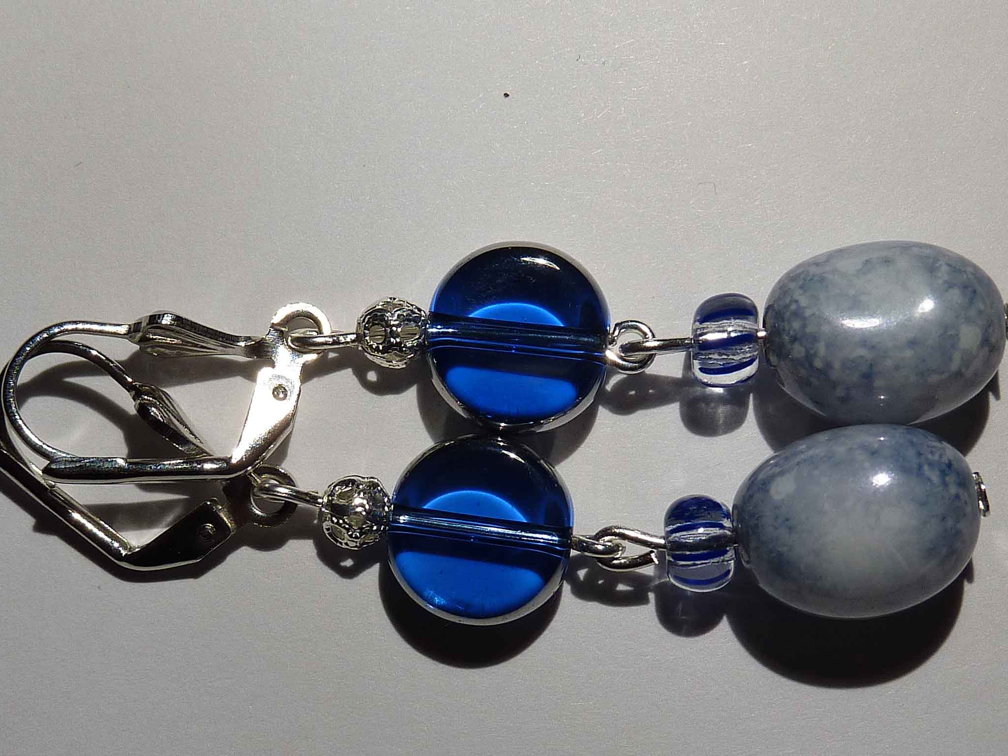 Description : Palet en verre bleu aux bords argentés sur belle perle bleutée.