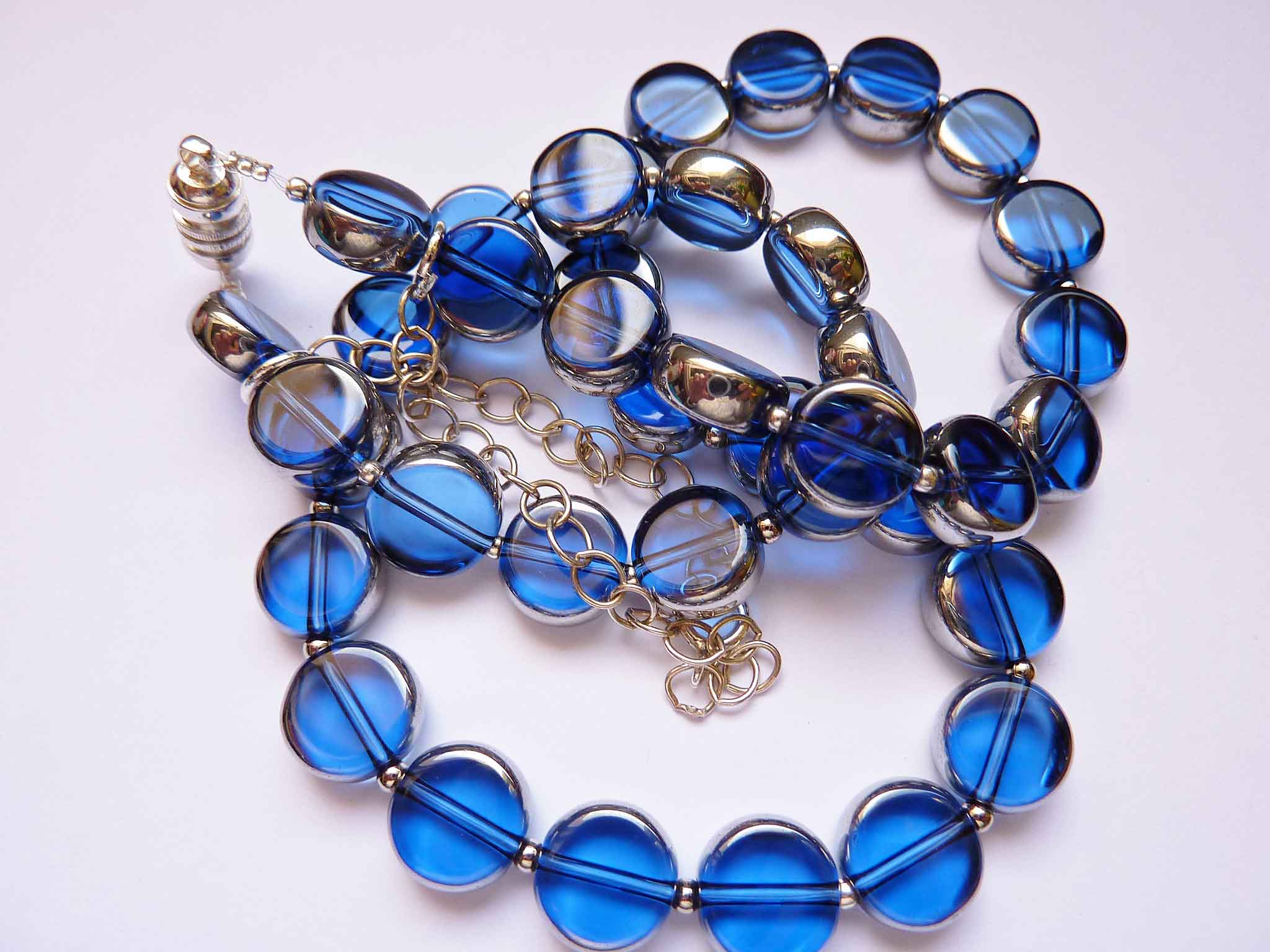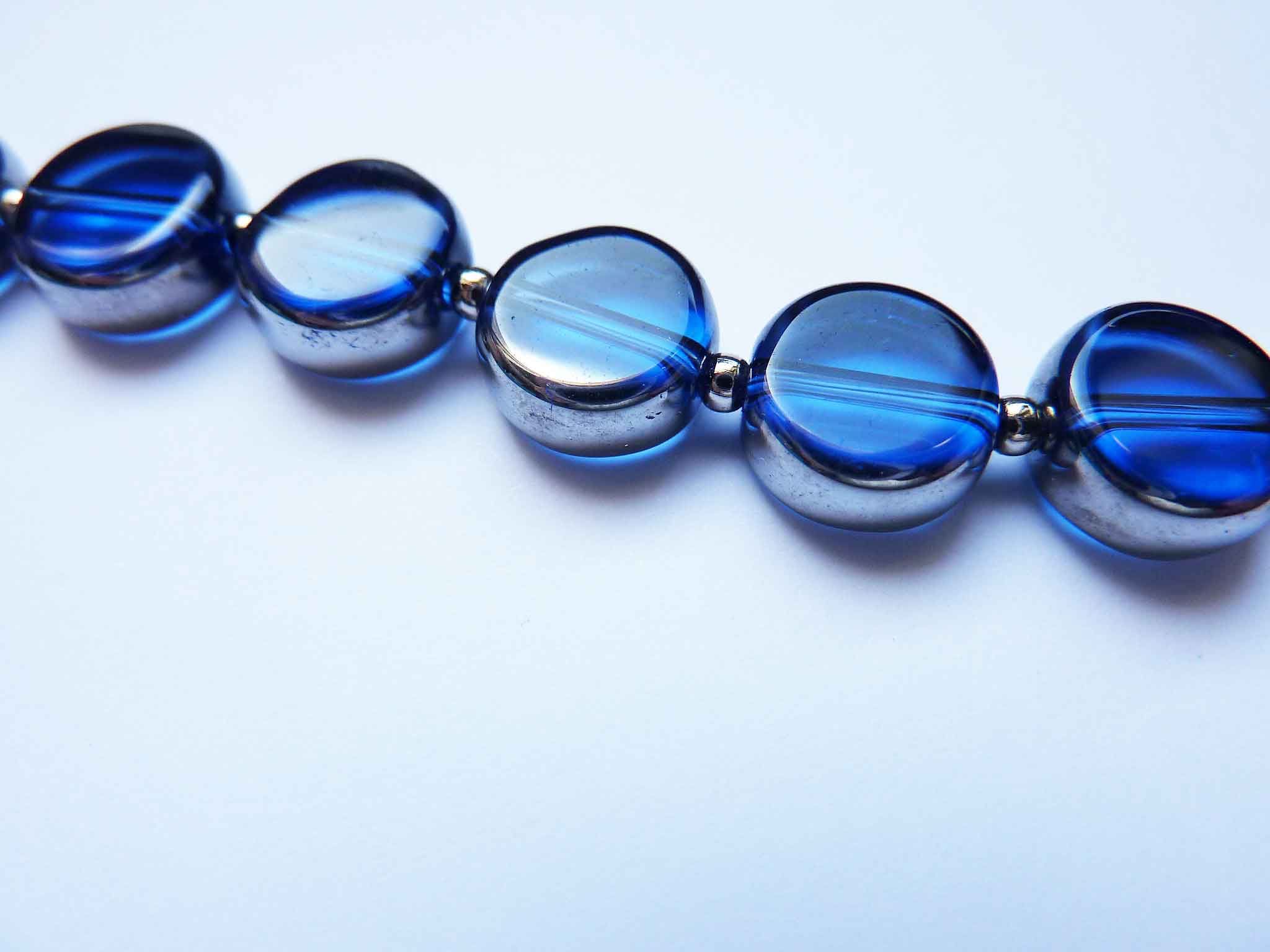 Description : Petit collier en palets ronds en verre bleu aux reflets métalliques intercalés de petites perles argentées