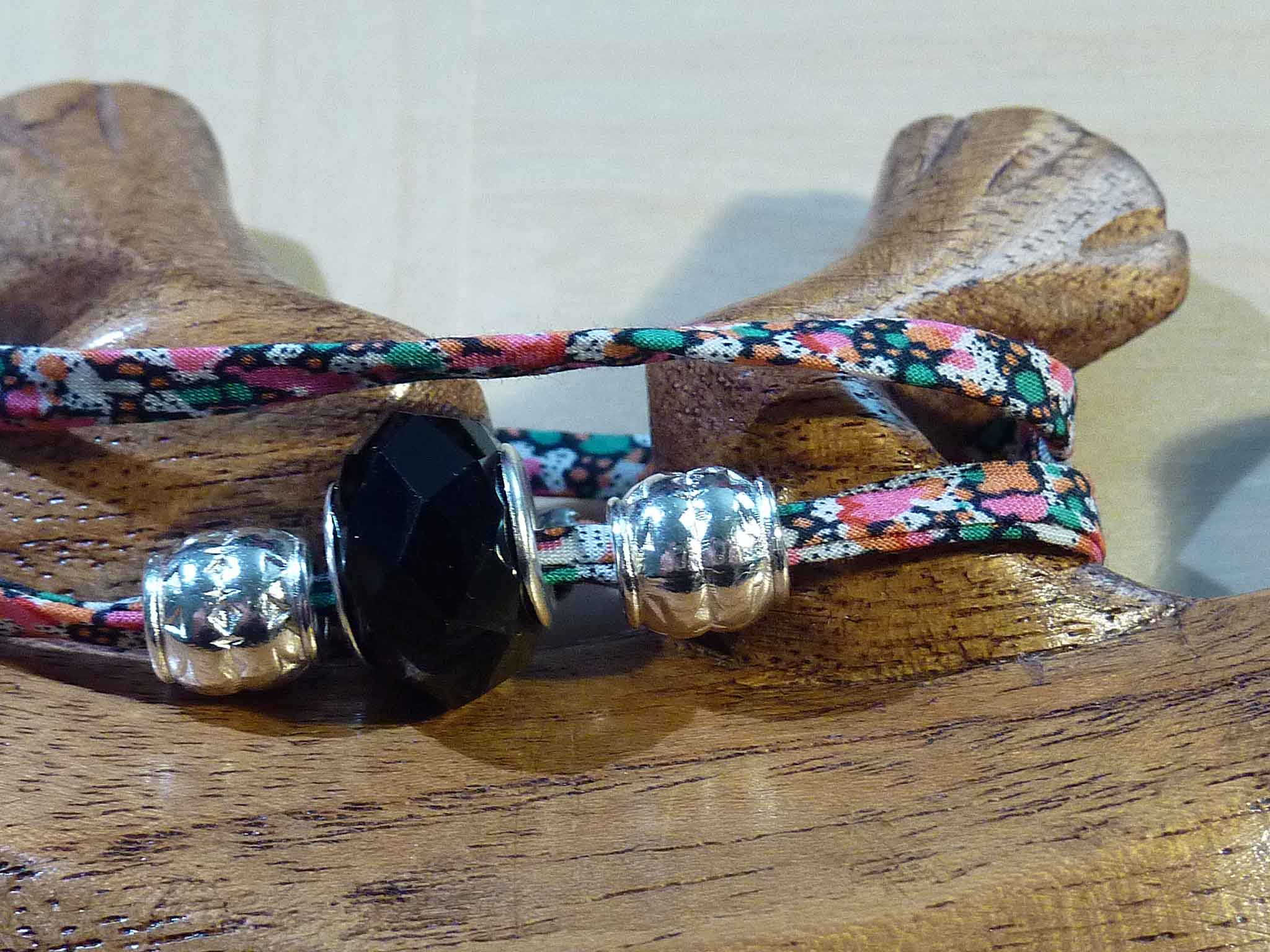 Description : Petit bracelet tout fin de 2 tours en biais de dominante rose avec une belle perle européenne en verre facettée noire entourée de perles argentées. Le fermoir est aimanté.