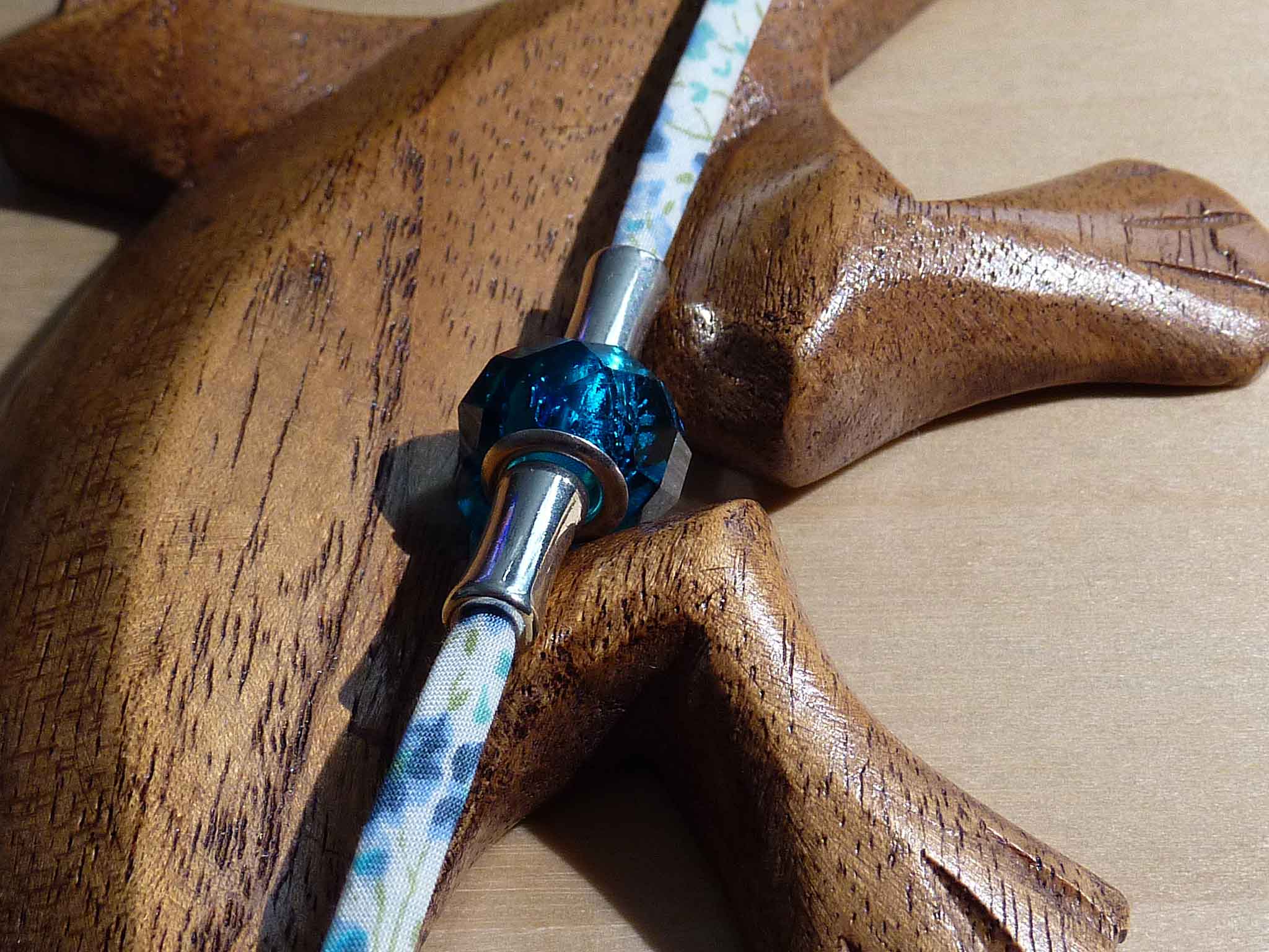 Description : Bracelet tout fin en biais avec une perle européenne entourée de 2 tubes en métal argenté. Le fermoir est aimanté.