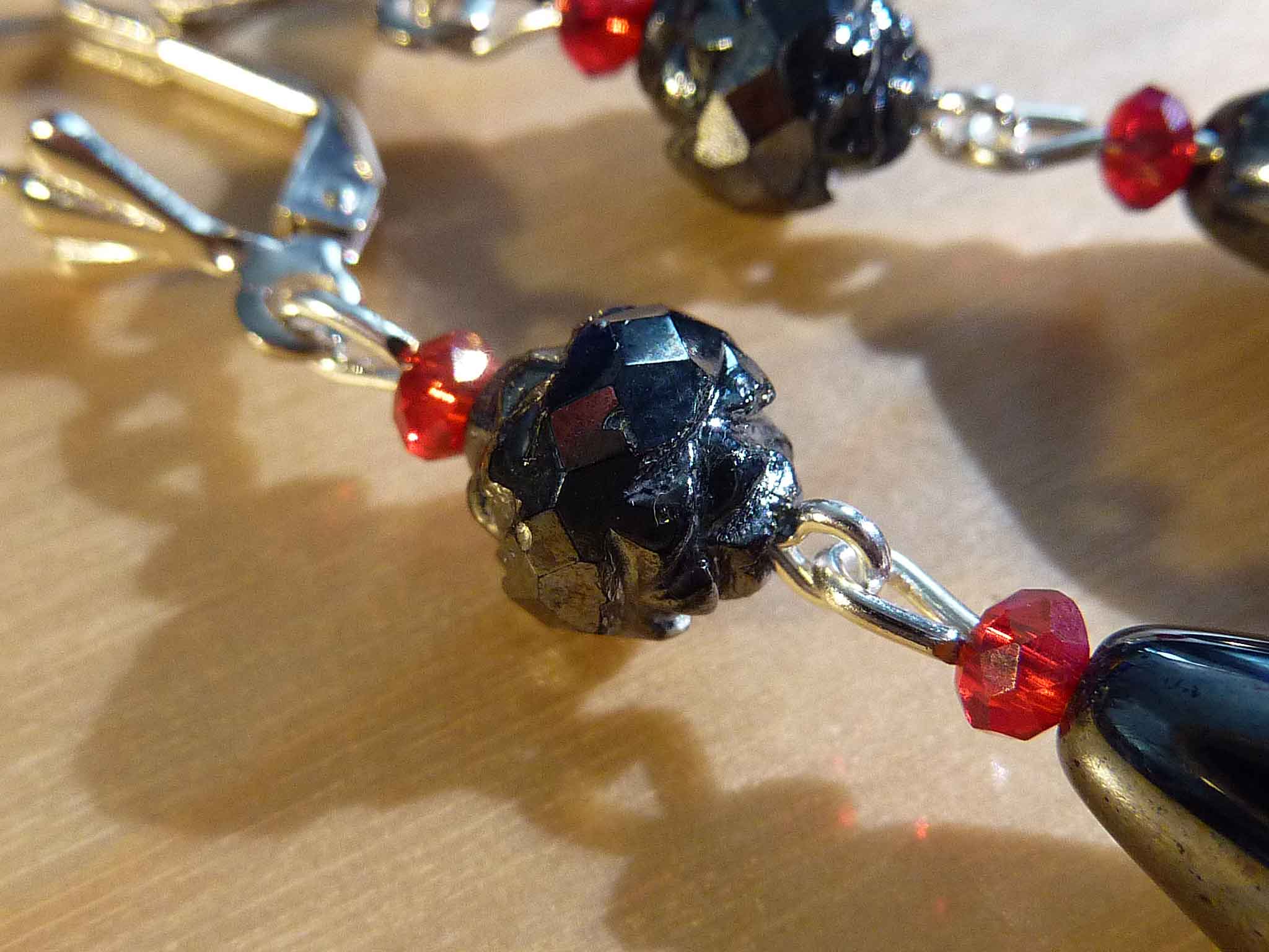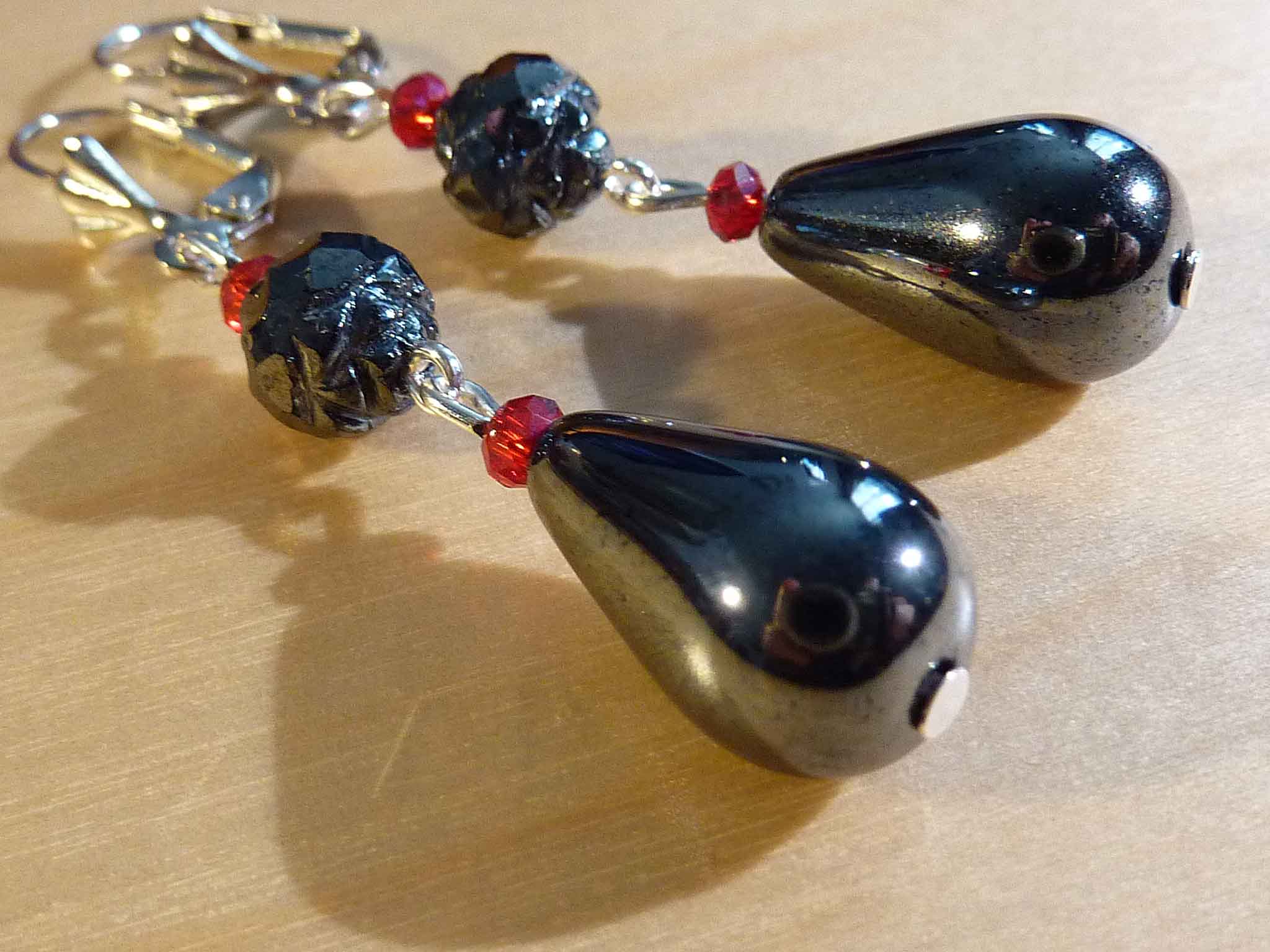 Description : Goutte et perle très ouvragée en verre anthracite et petits cristaux rouges