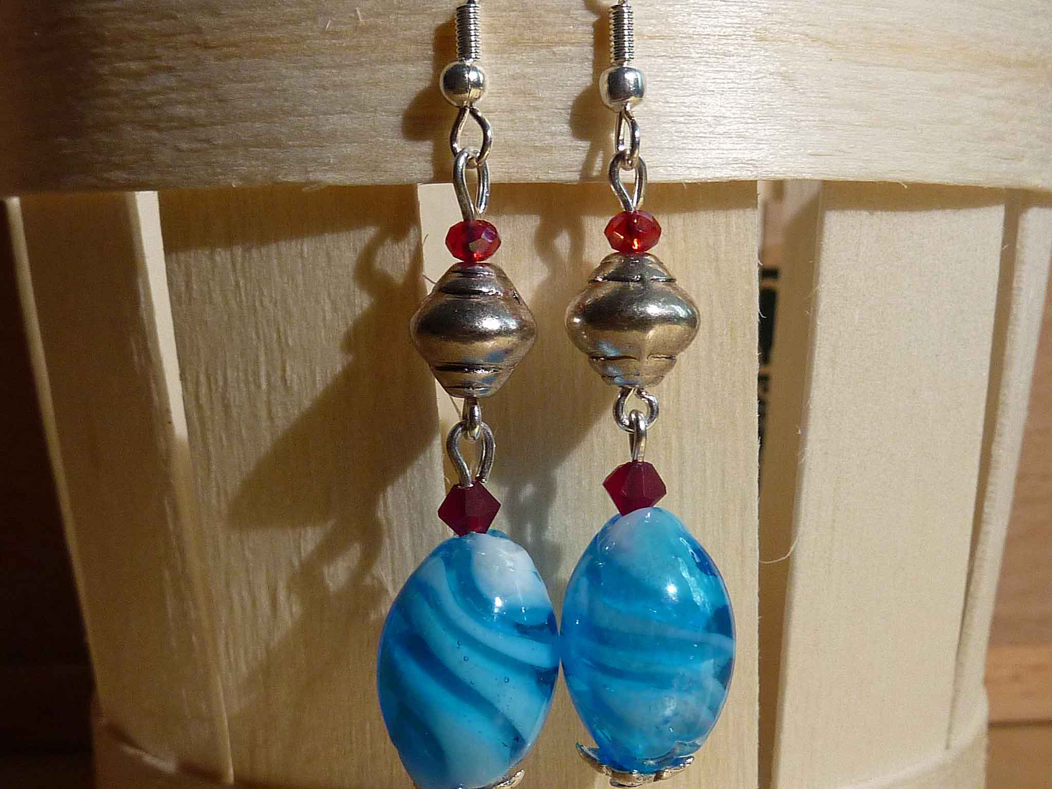 Description : Perle en verre de bohème turquoise agrémentée de petits cristaux rouges sur monture argentée.