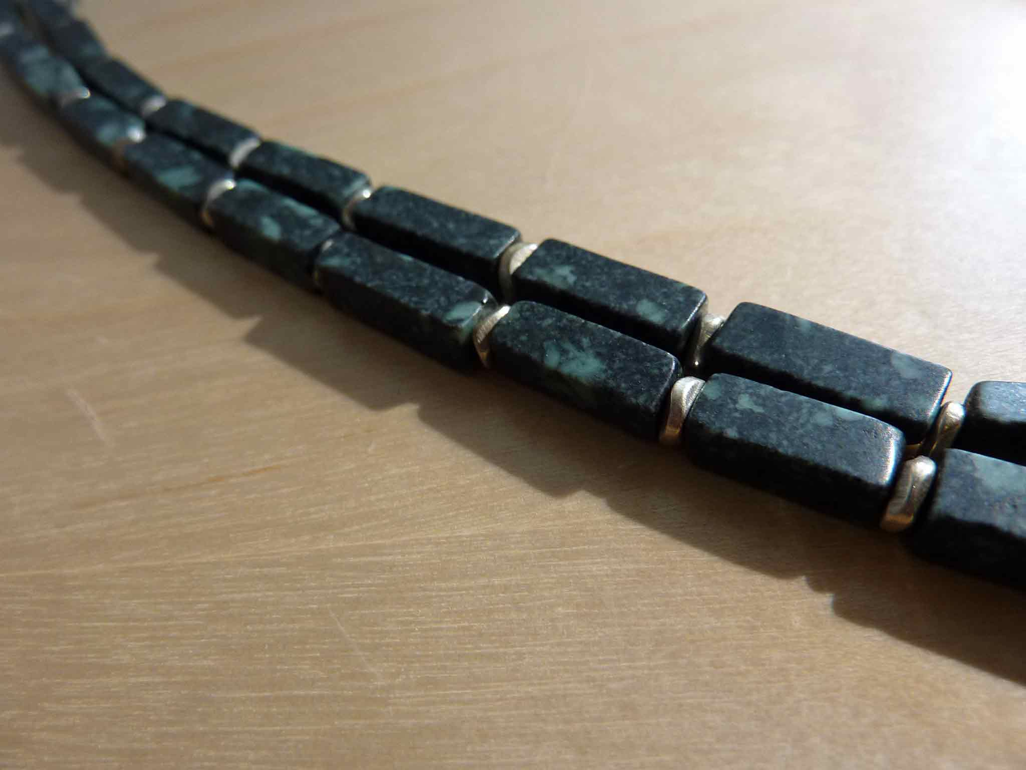 Description : Joli collier à double rangs en cubes longs en jaspe vert avec des petites perles plates argentées