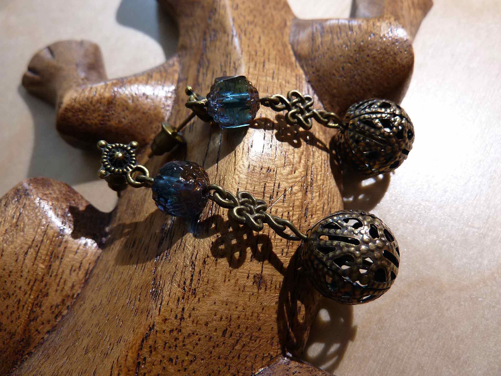 Description : Bien vintage cette paire avec ses perles en métal ouvragé bronze et ses petites perles en verre bleu et cuivre.