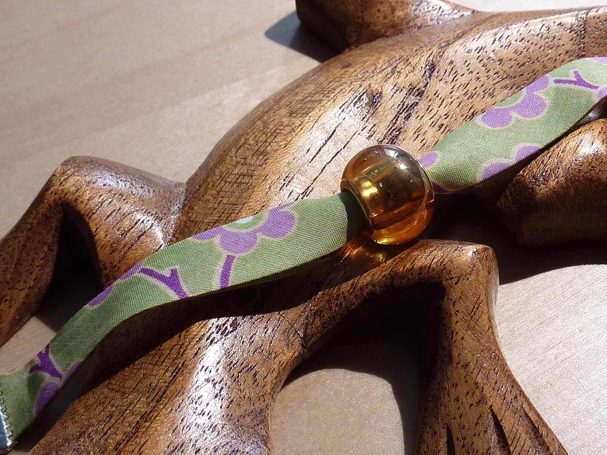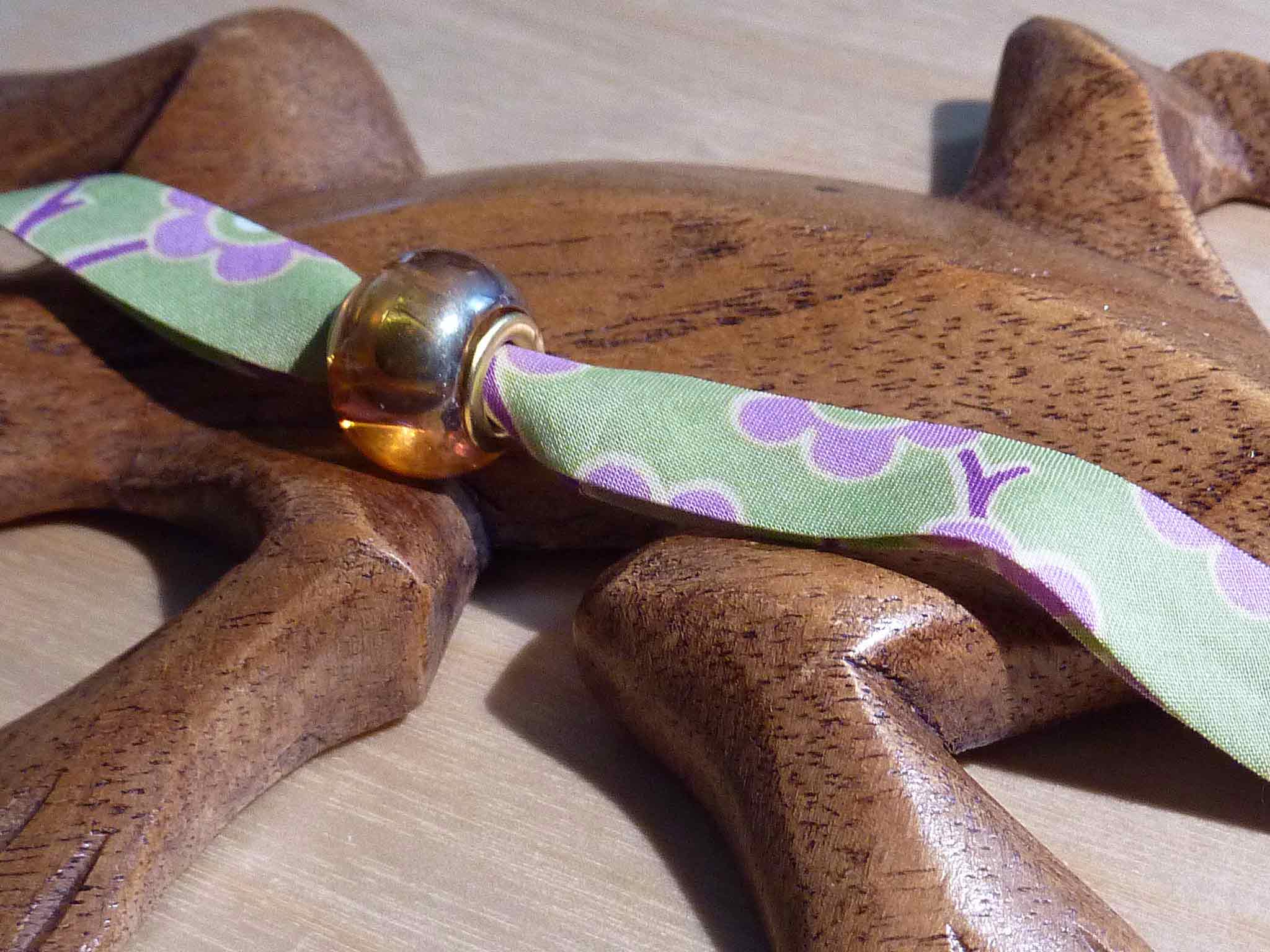 Description : Un joli biais vert pâle aux fleurs roses avec une belle perle européenne aux reflets dorés et rosés. Fermoir aimanté.