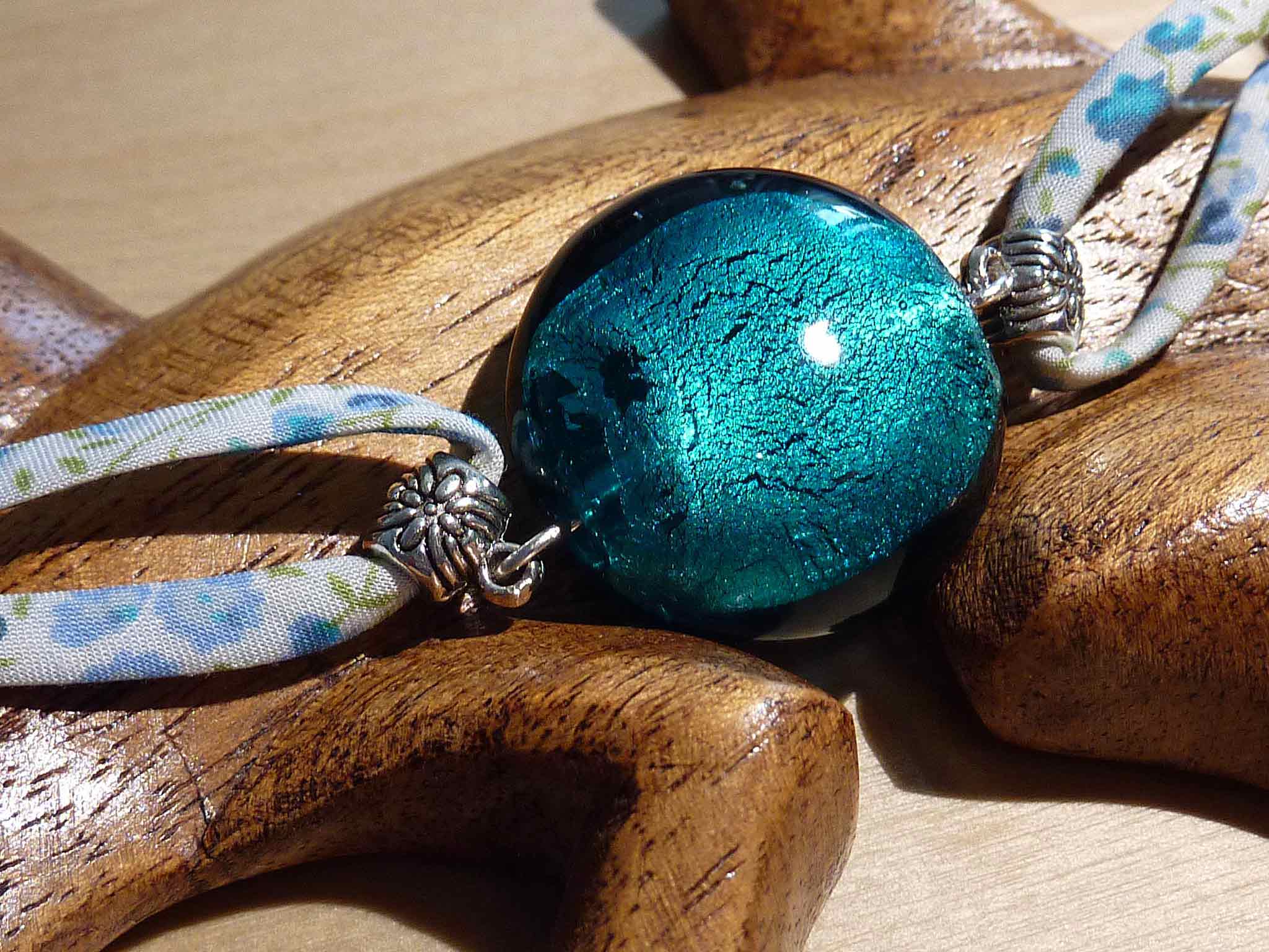 Description : Un beau palet en verre turquoise avec feuille argenté sur un petit biais doublé sur une monture argentée.