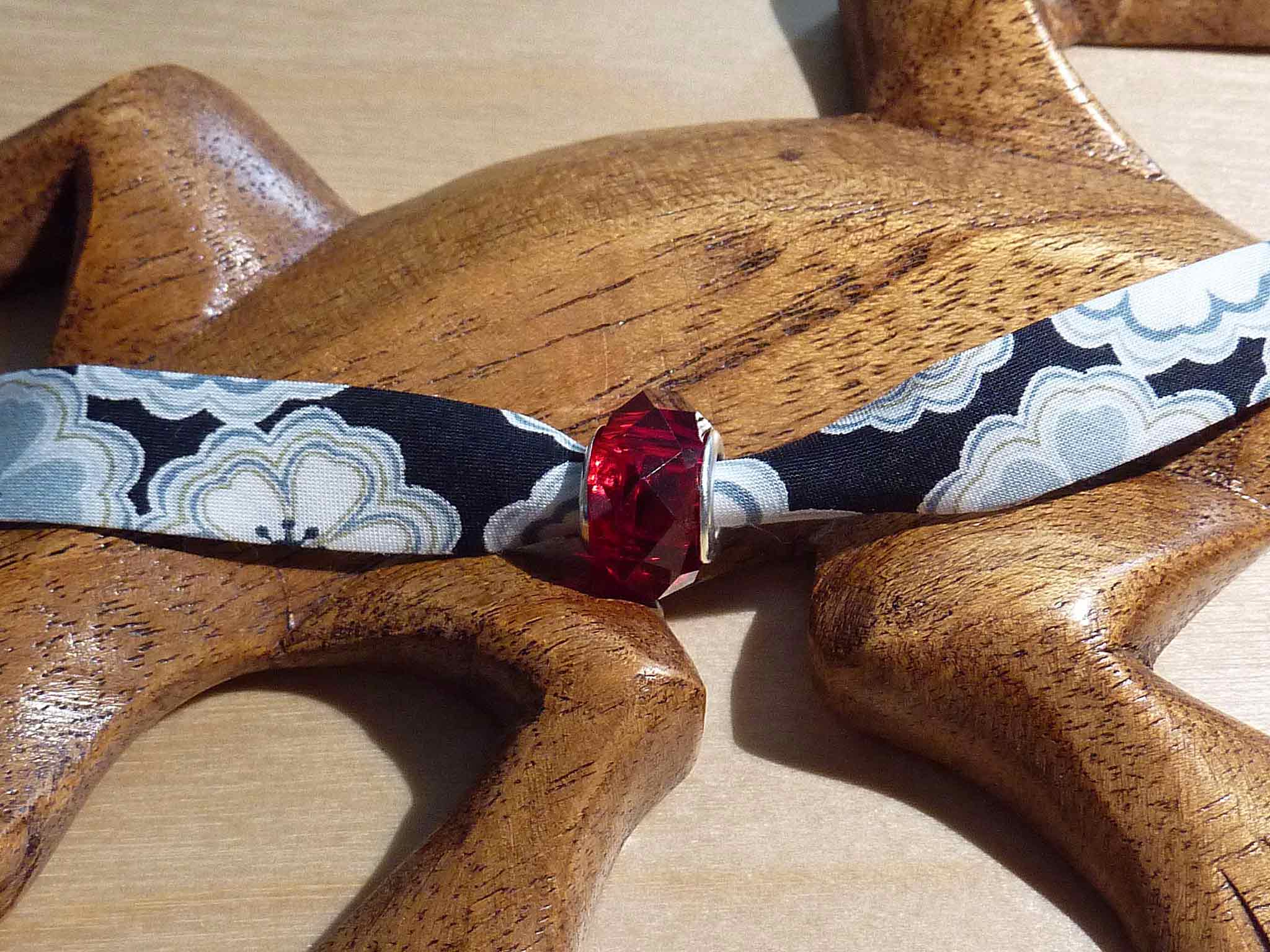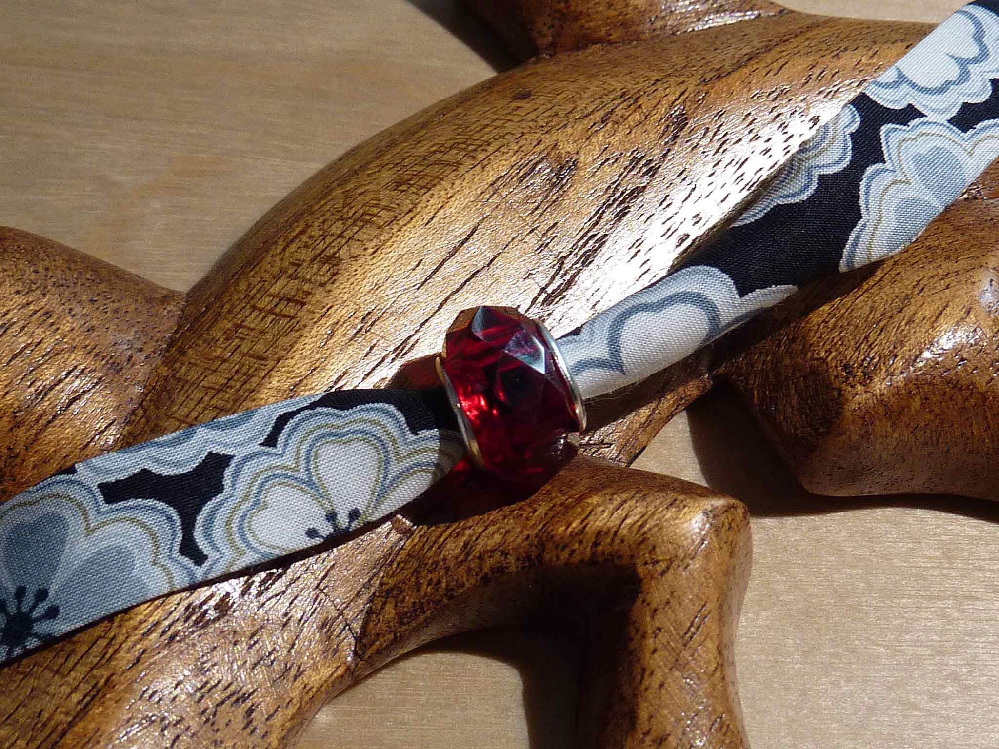 Description : Un joli biais noir aux fleurs blanches et grises avec une belle perle européenne rouge à facettes. Fermoir aimanté.