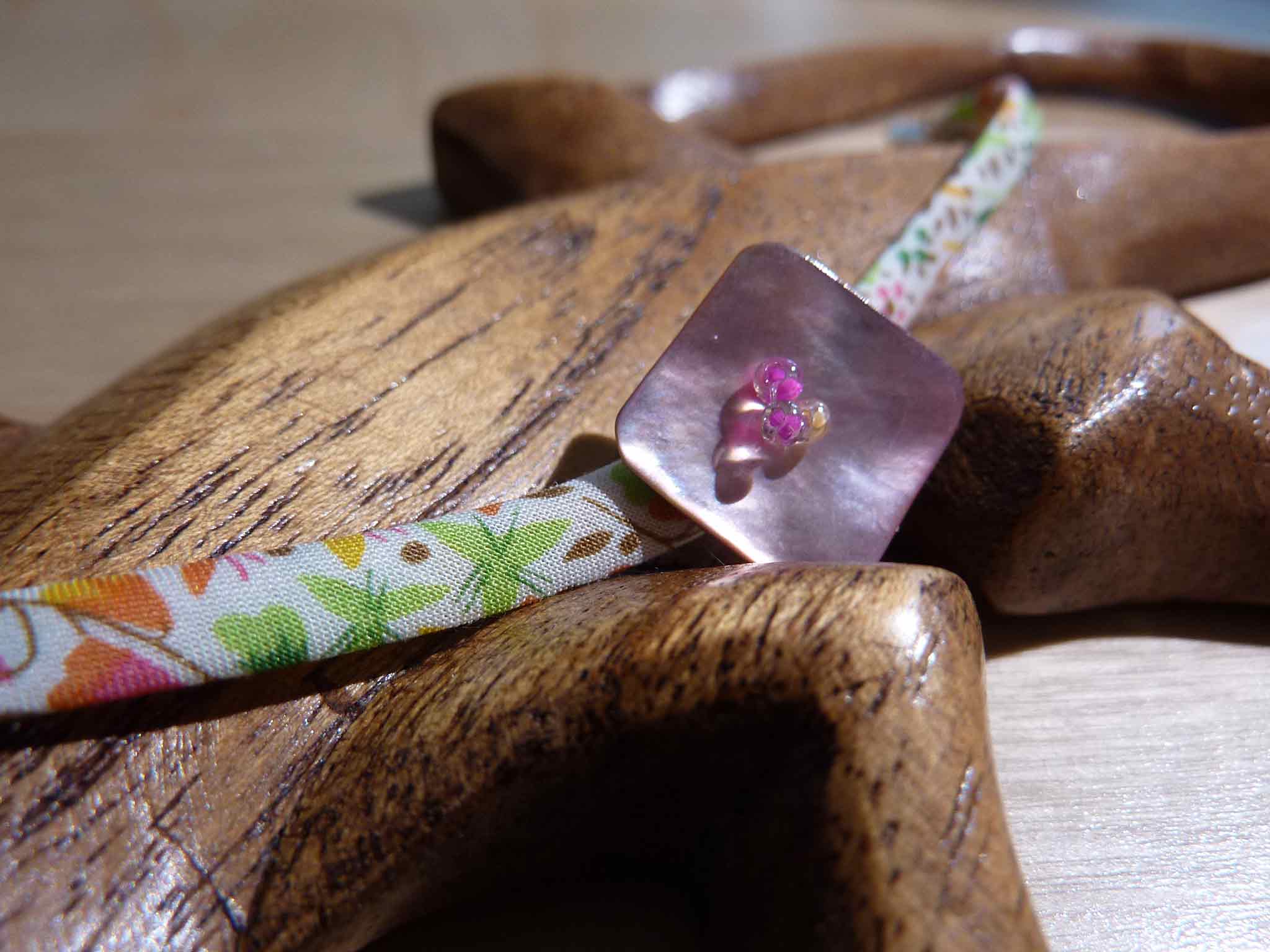 Description : Biais tout fin aux couleurs estivales et un carré de nacre rose.