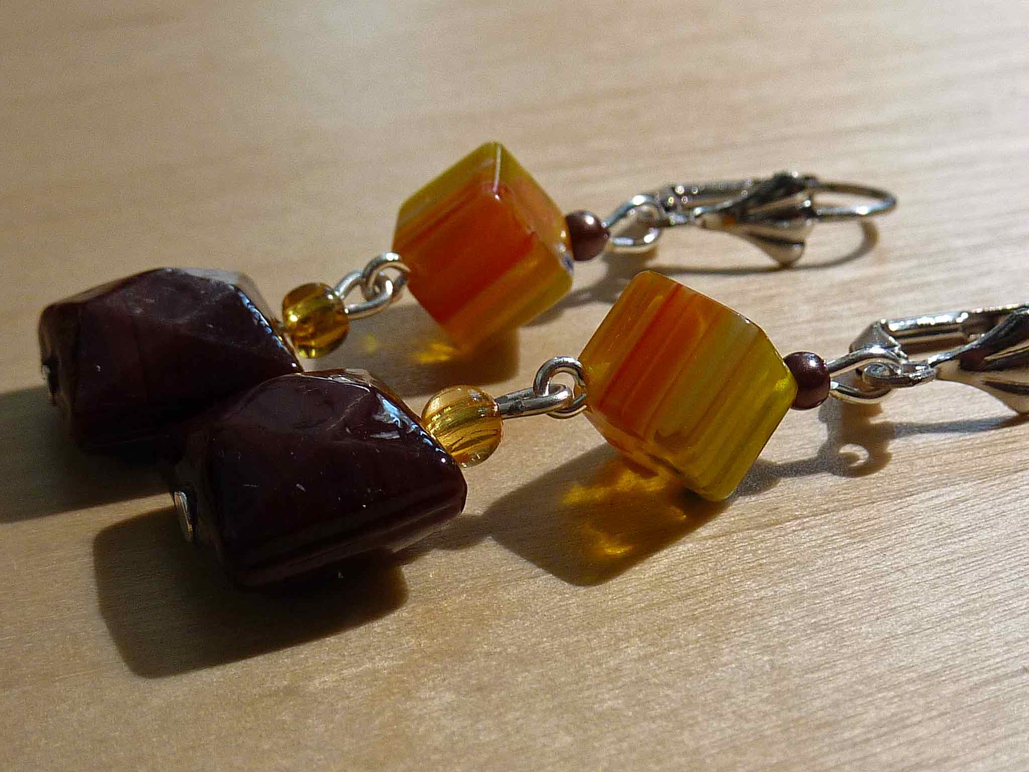 Description : Paire multiforme: cube en verre millefiori orangé et terminée par palet brun en verre indien.