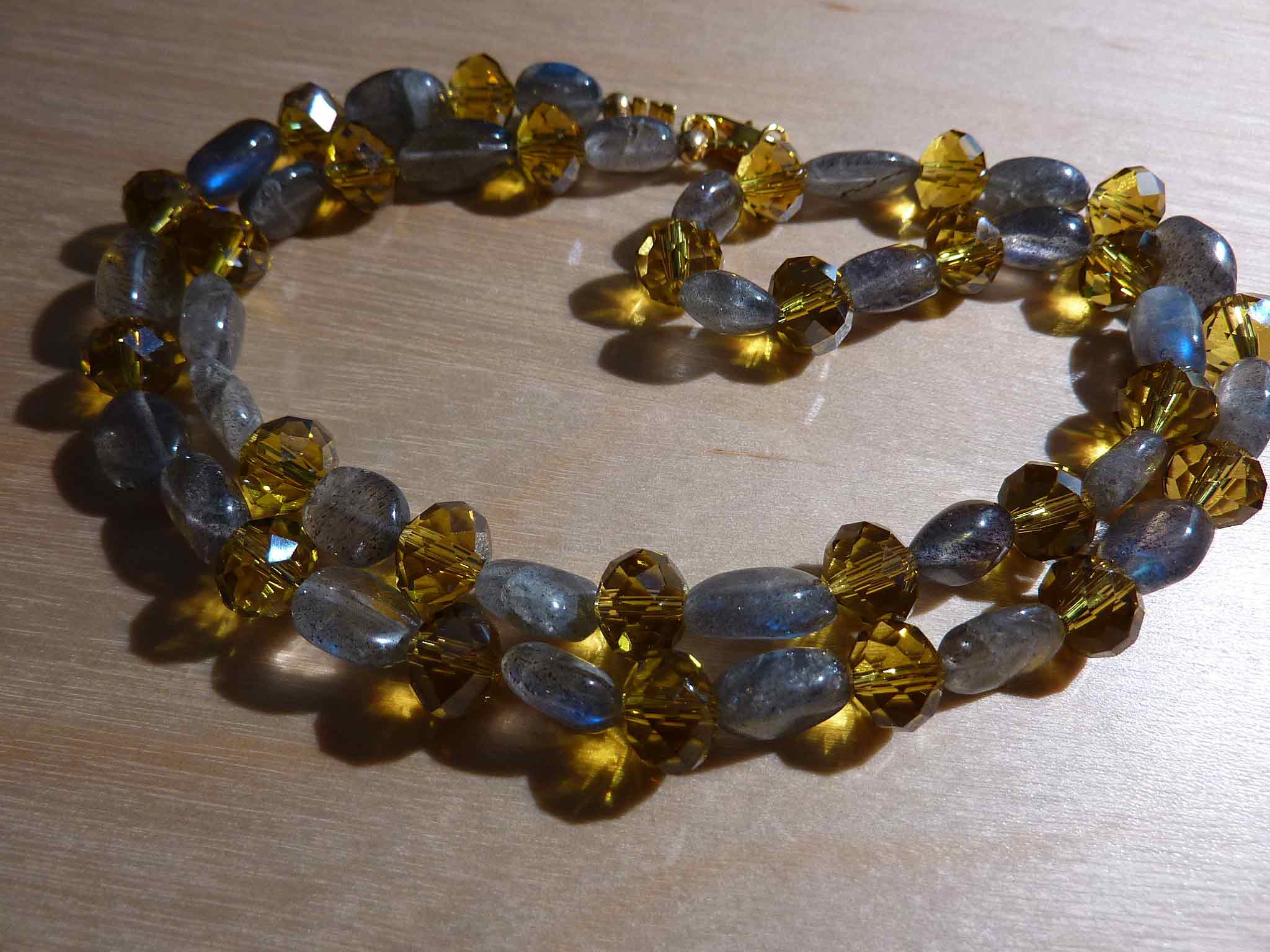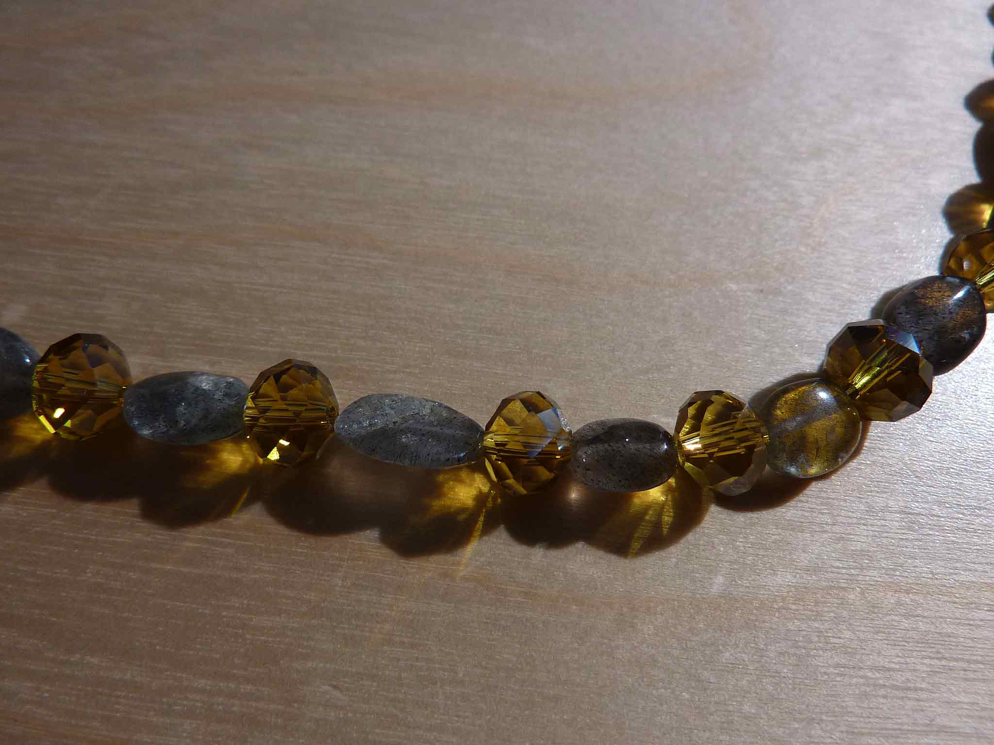 Description : Petit collier tout mignon en palets de labradorite intercalés de perles facettées jaunes.