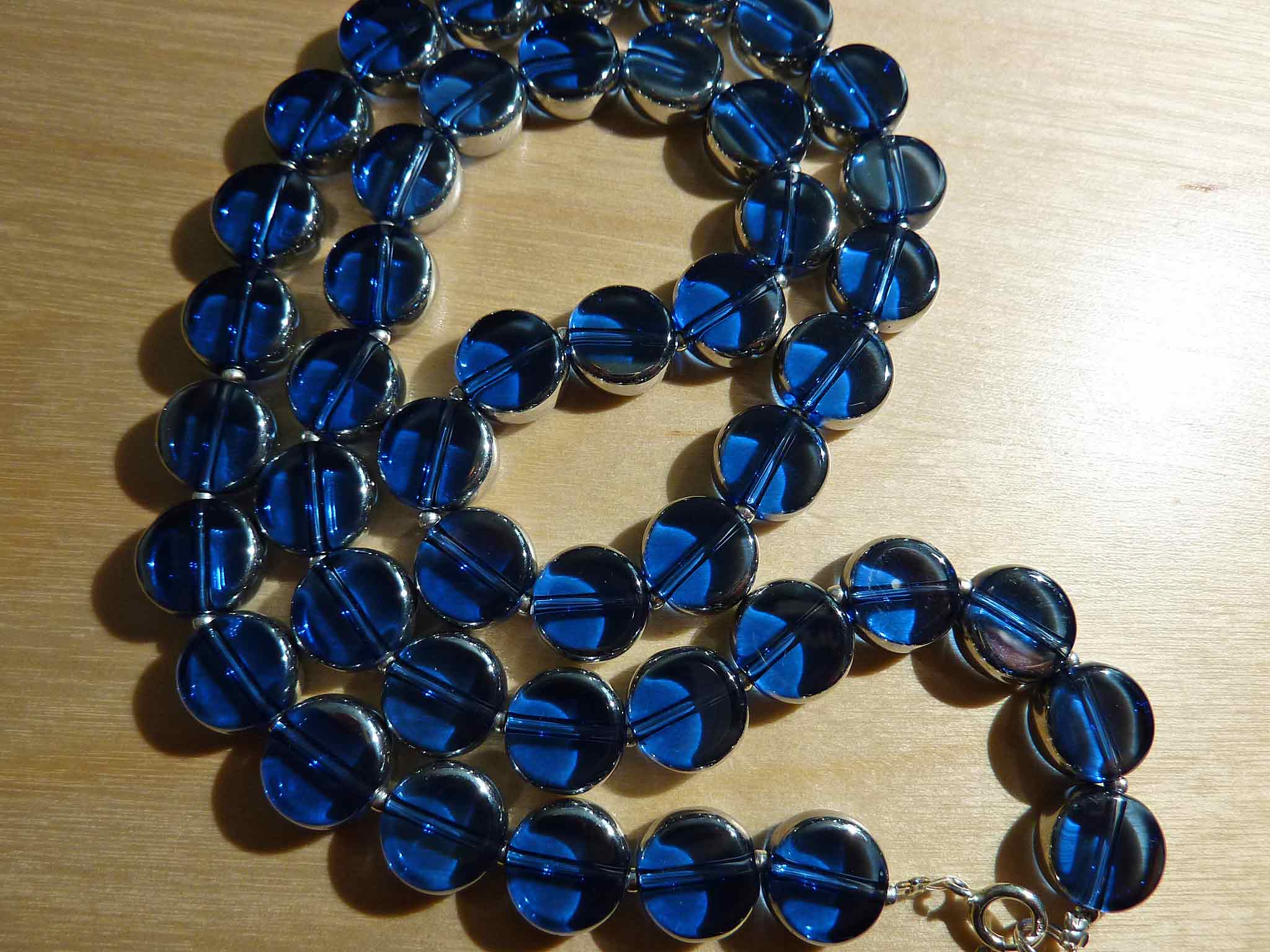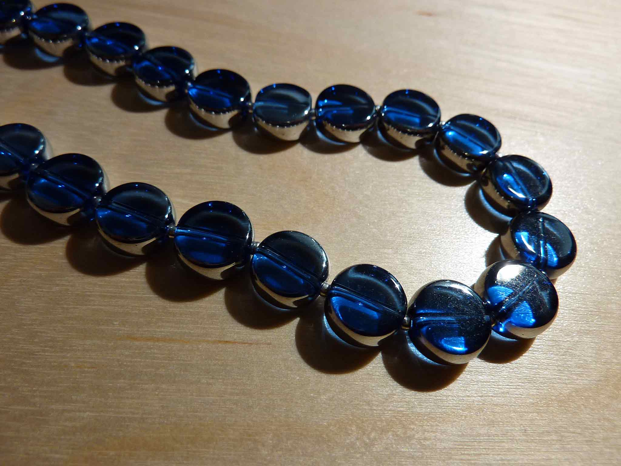 Description : Collier en palets ronds en verre bleu aux reflets métalliques intercalés de petites perles argentées.