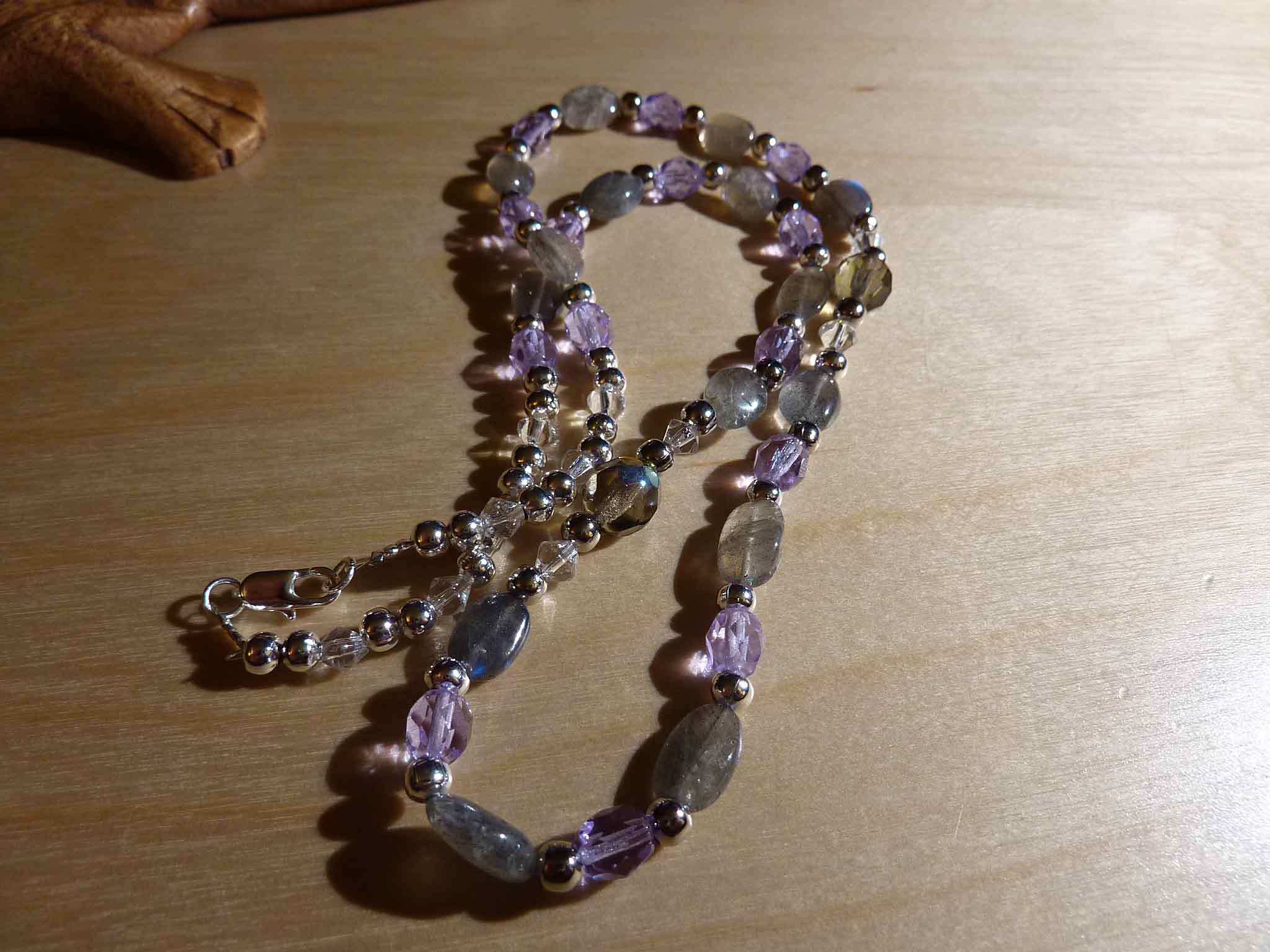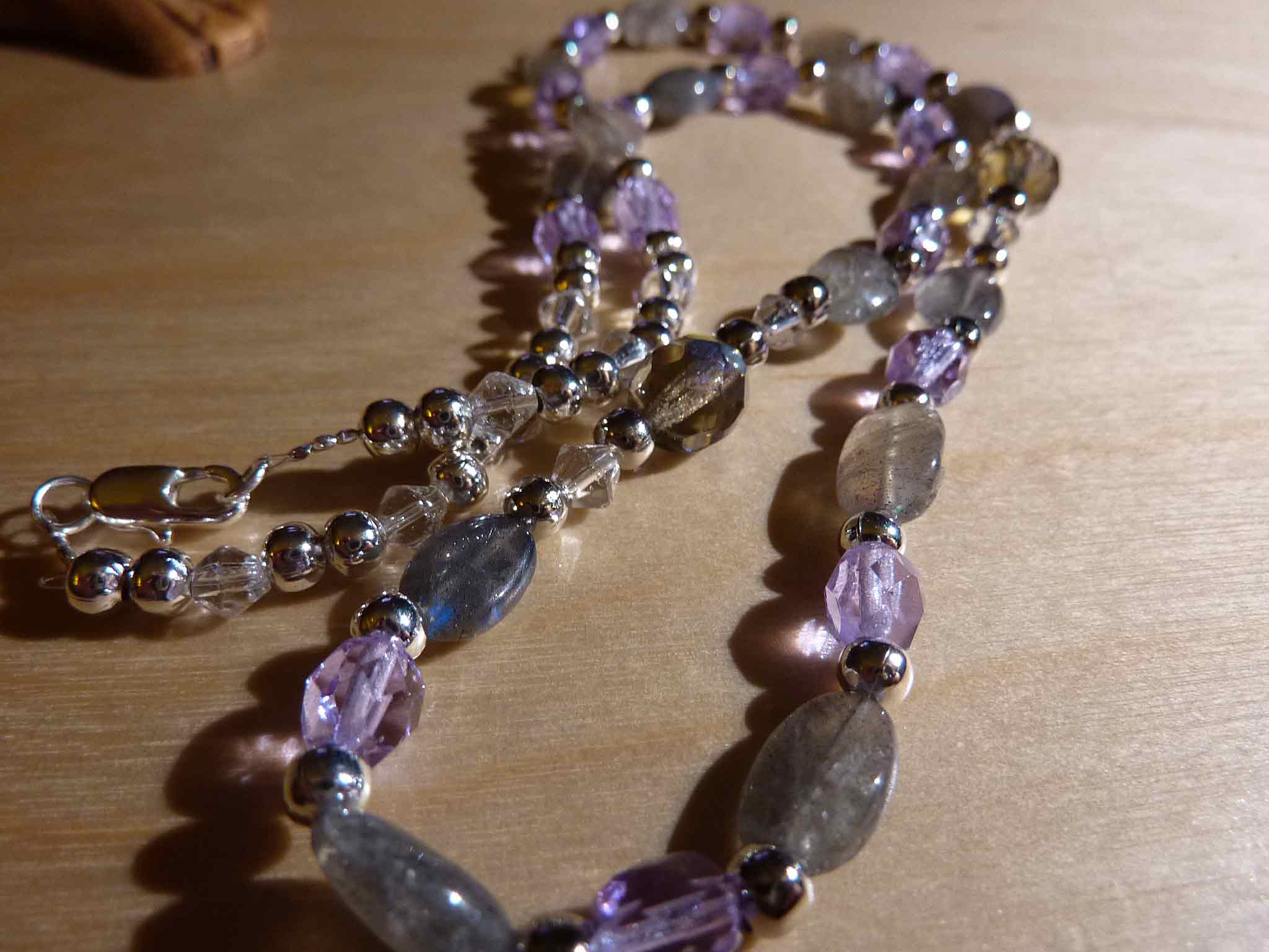 Description : Petit collier tout mignon en palets de labradorite intercalés de perles facettées mauves et de perles argentées