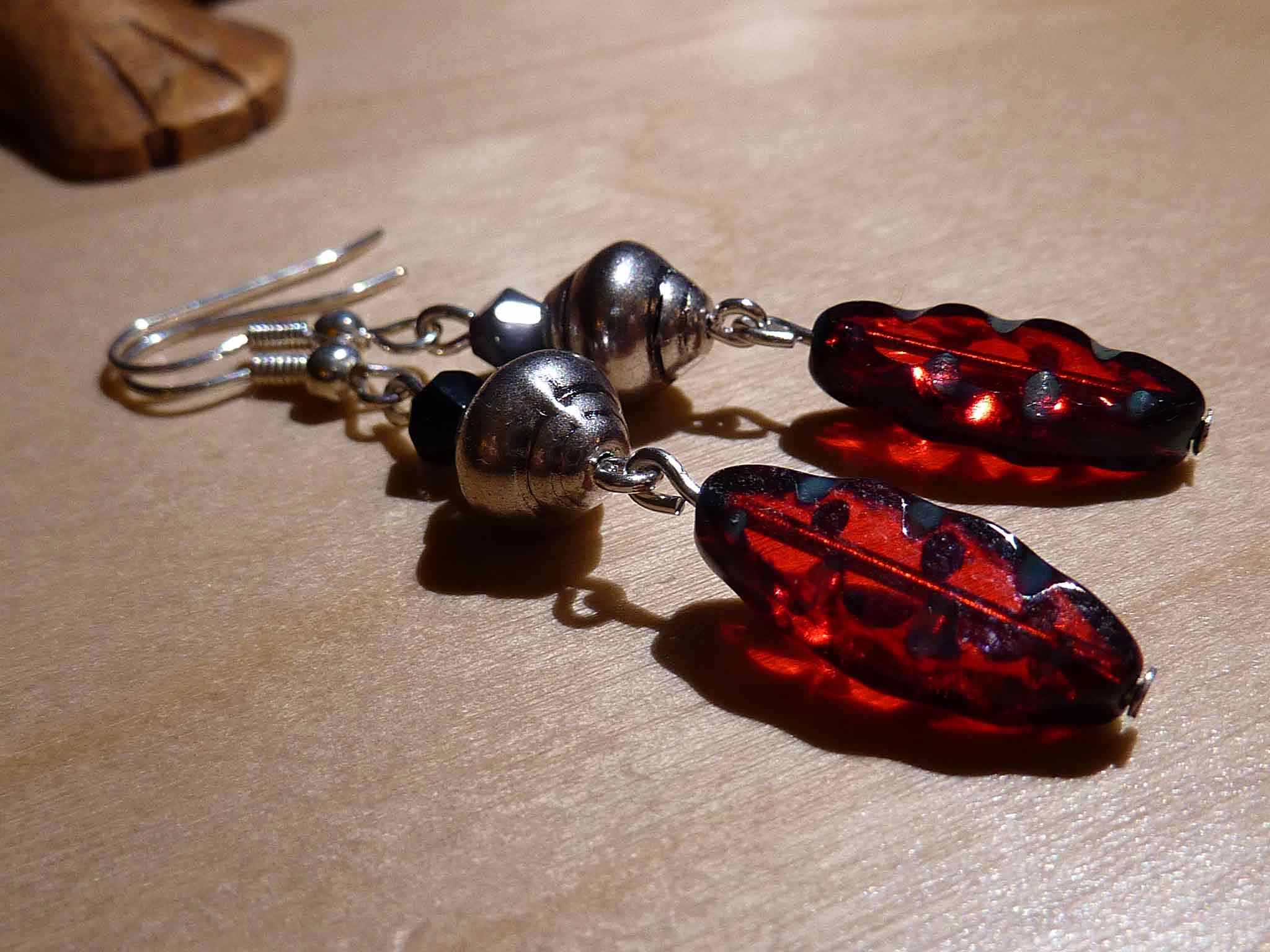 Description : Boucle vintage avec une perle longue en cristal de bohème rouge et une perle argentée et un petit cristal swarowski noir
