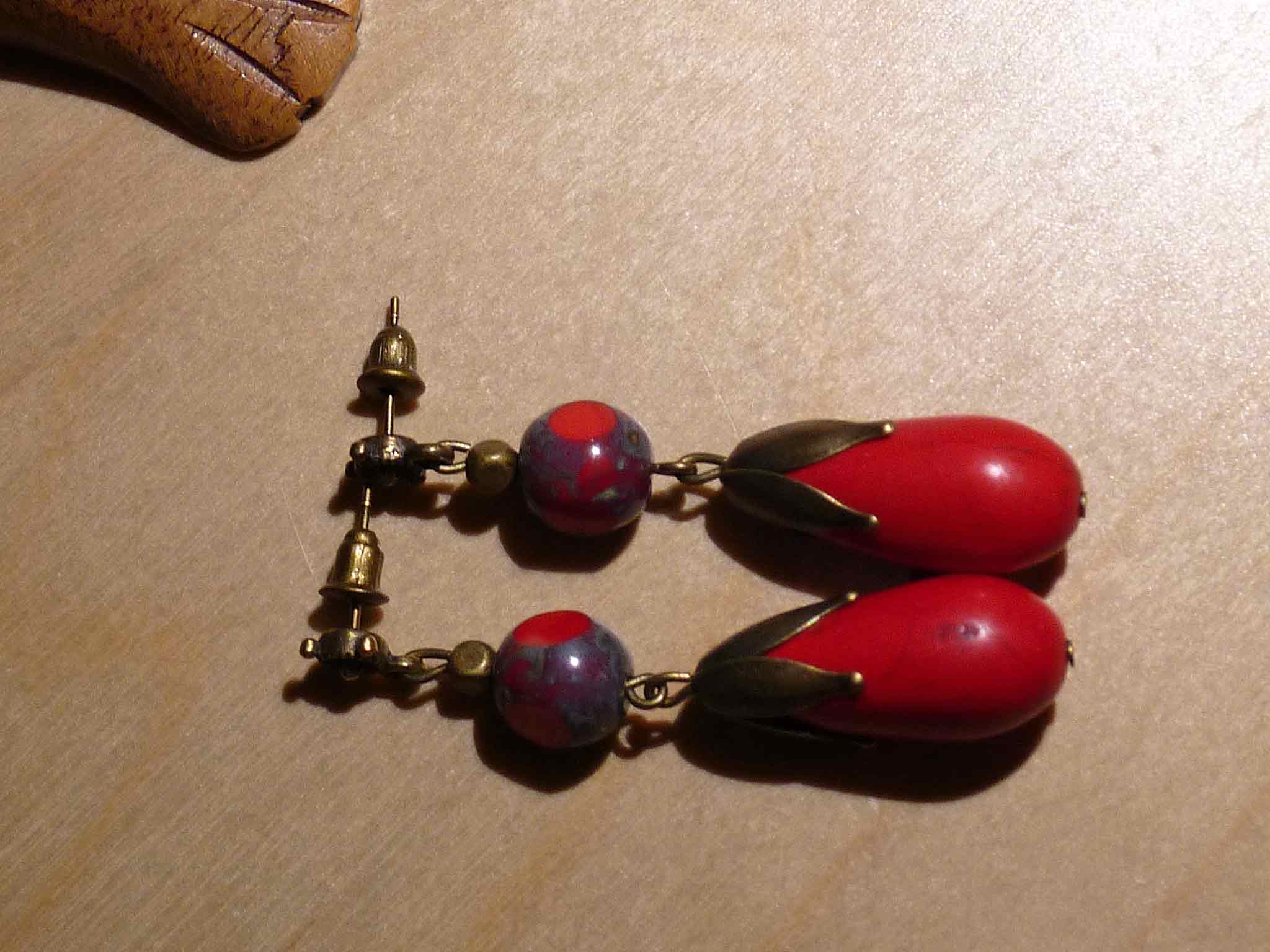 Description : Longue goutte d'howlite rouge avec une perle rouge et bronze