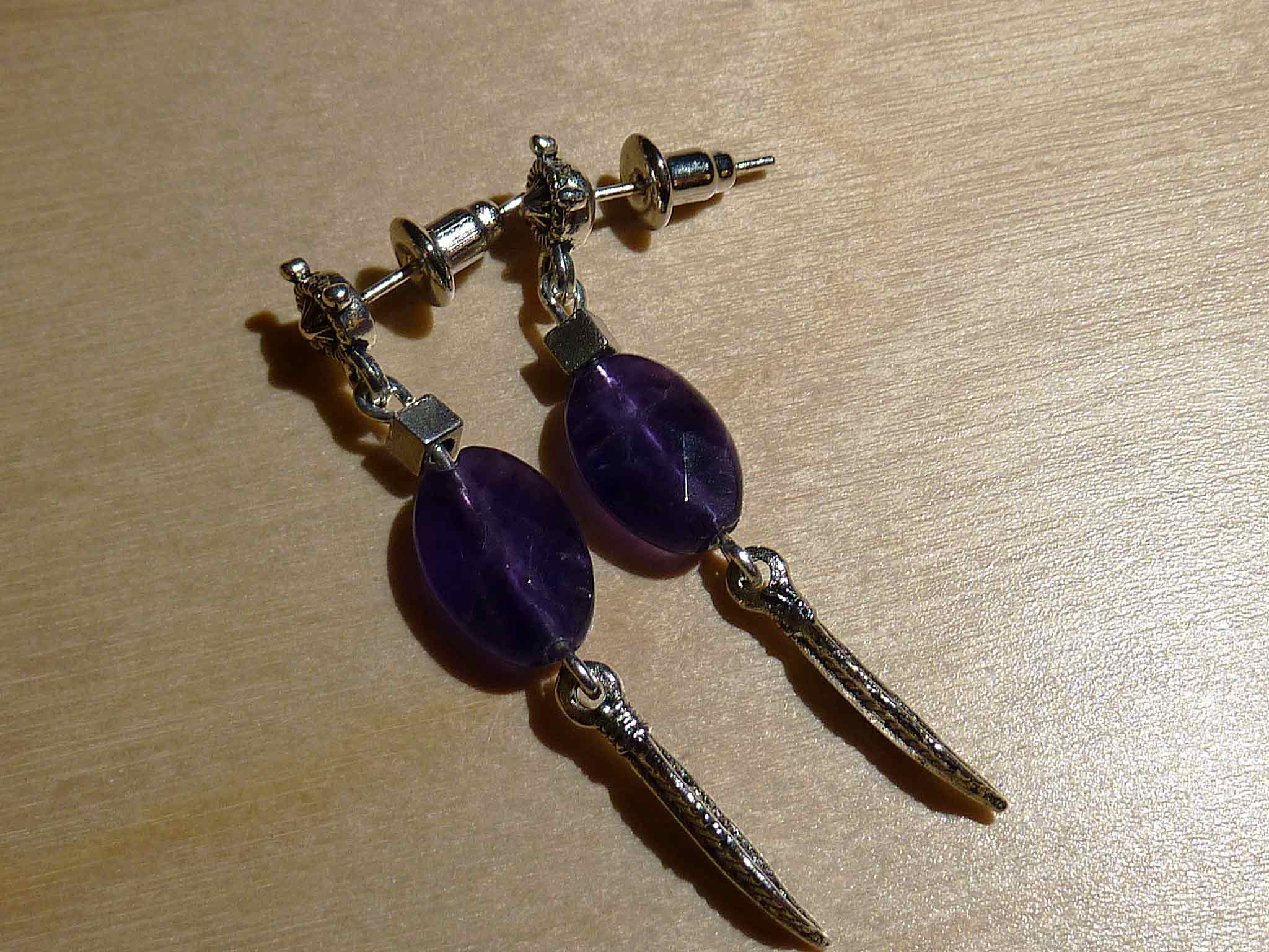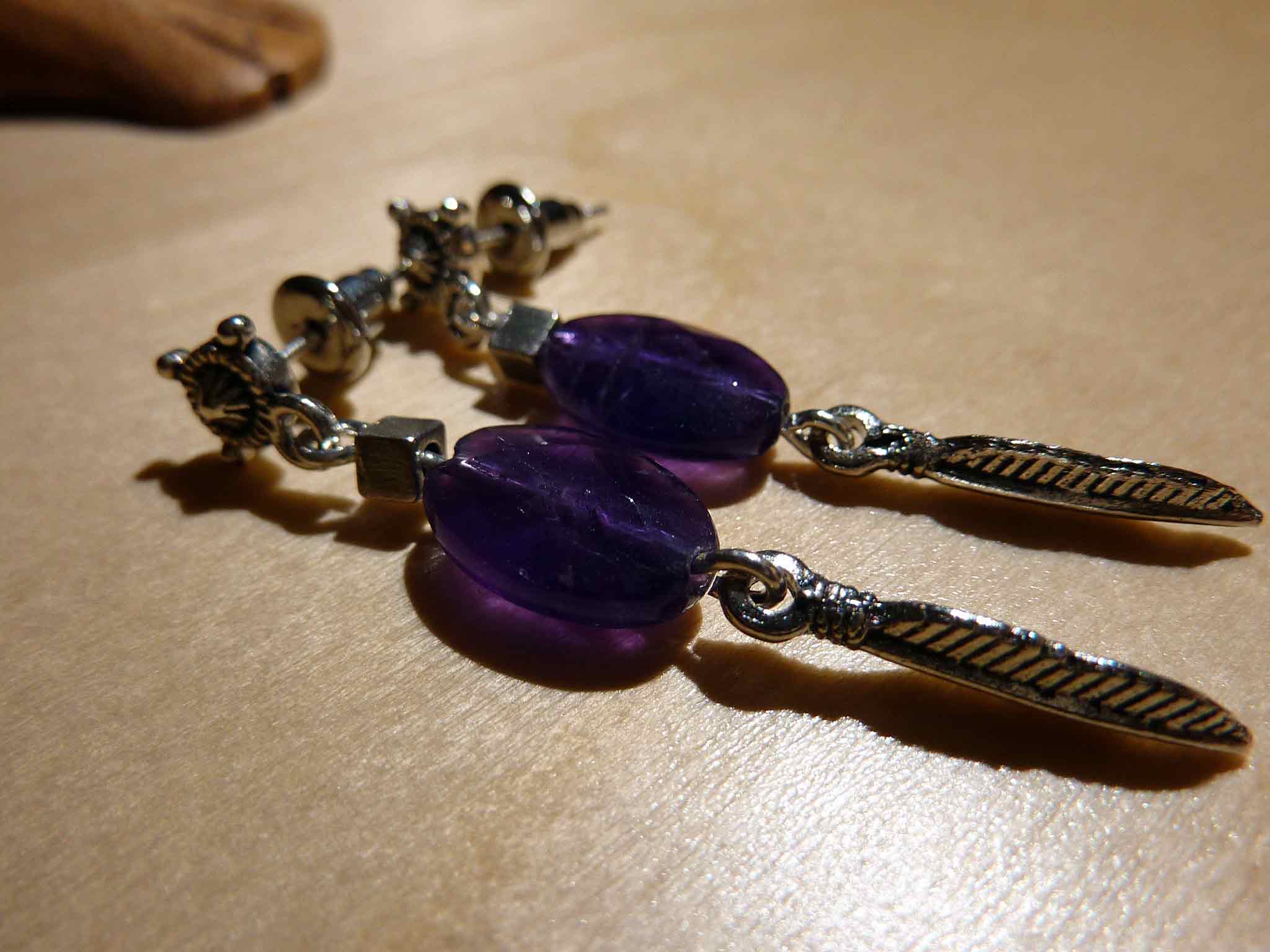 Description : Boucle toute fine avec un petit palet en amesthyste et se terminant par une feuille argentée