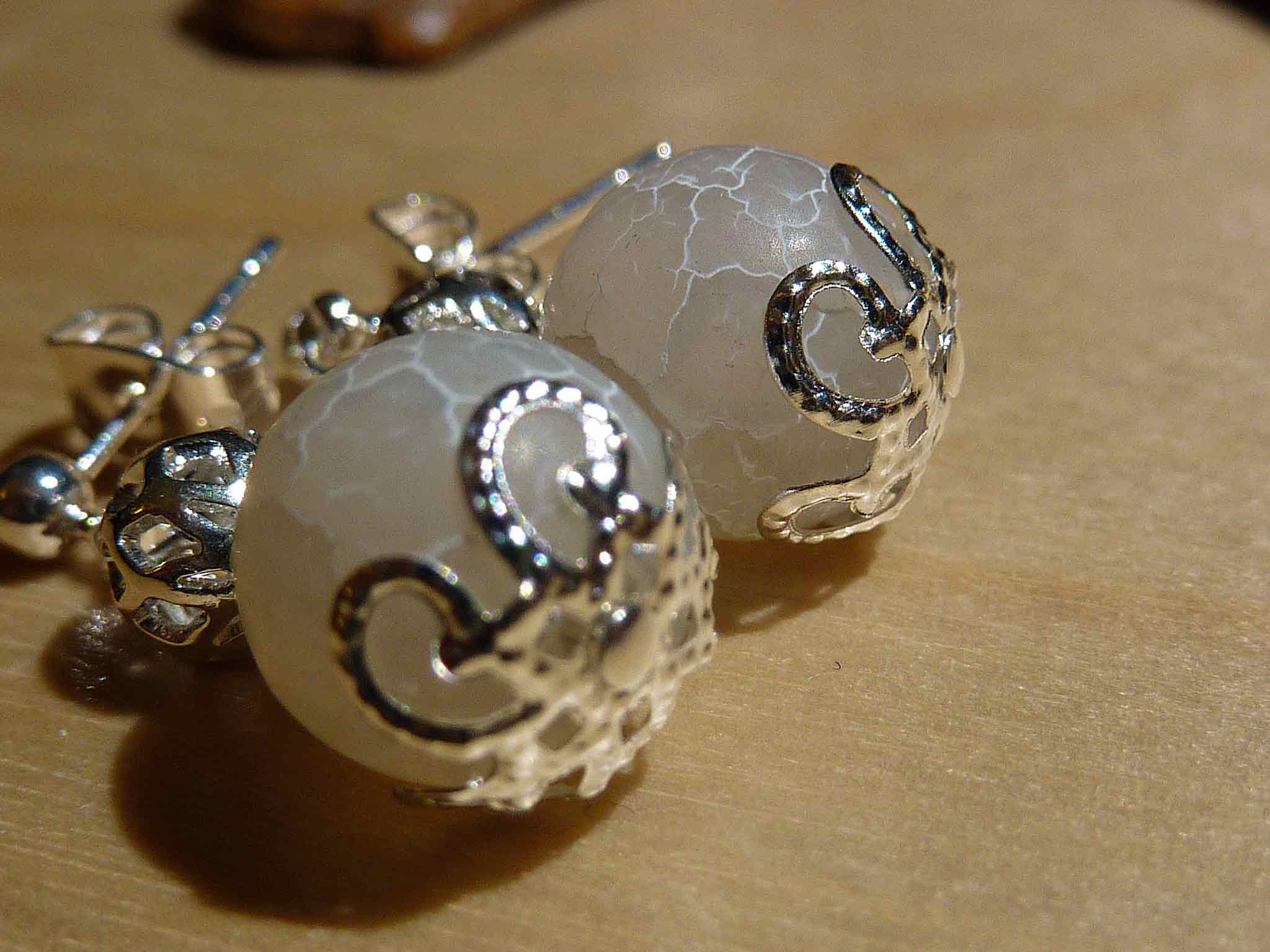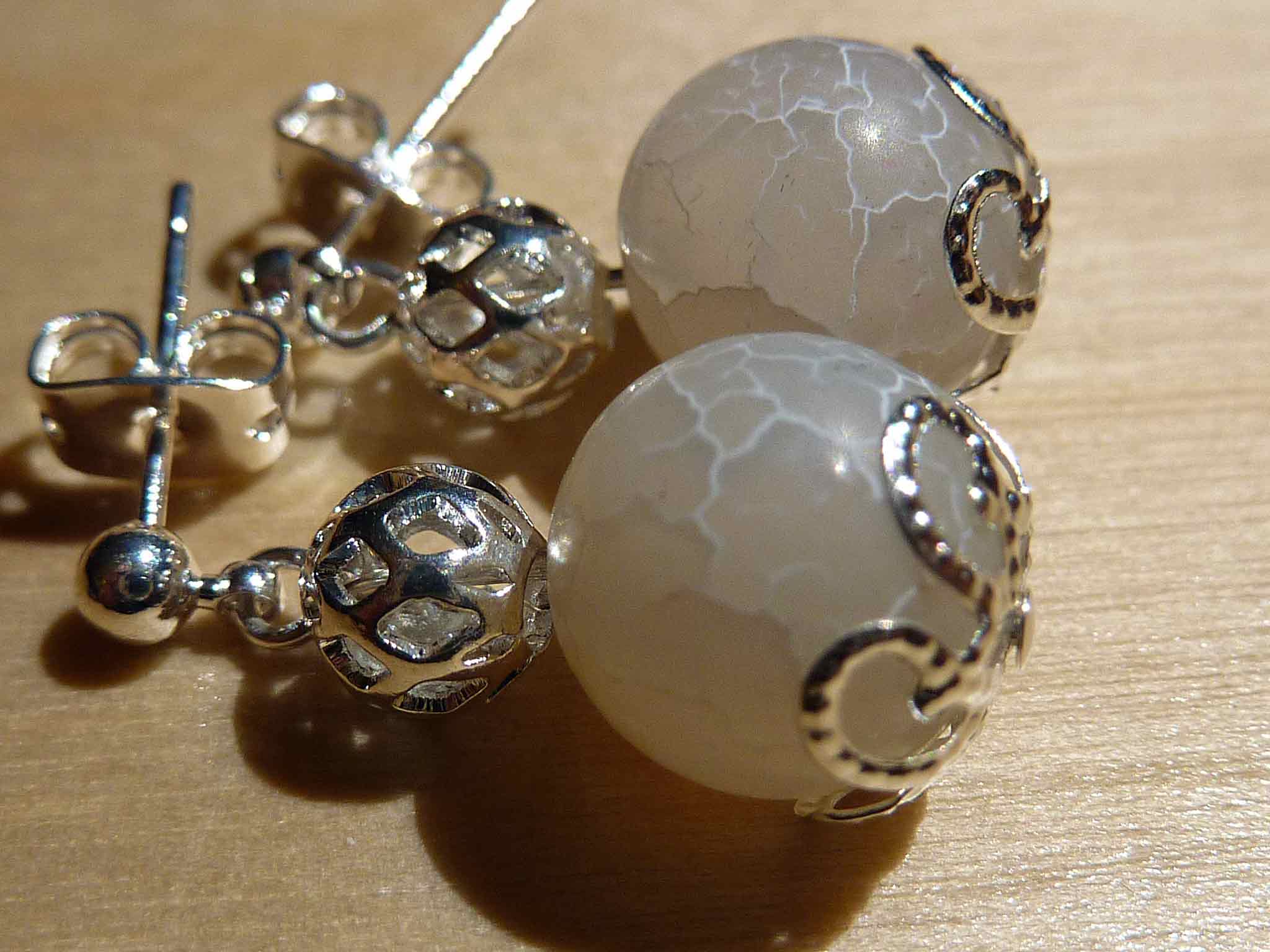Description : Toute petite boucle composée d'une perle en agate craquelée blanche sur une monture très ouvragée argentée