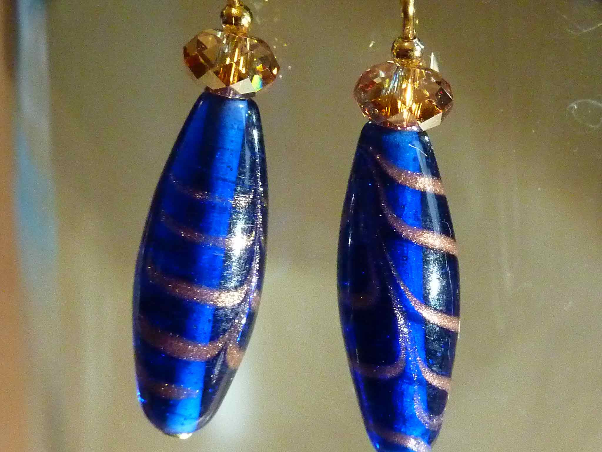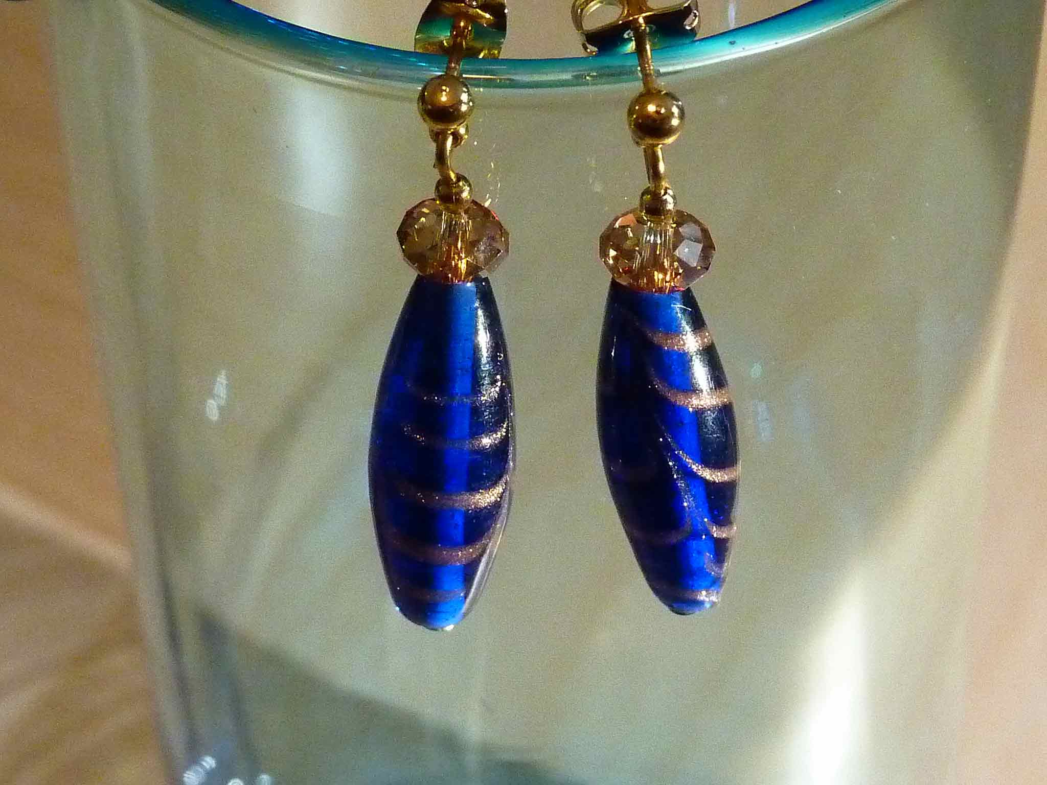 Description : Jolie olive en verre de bohème bleu nuit aux dessins dorés avec un petit cristal swarowski doré