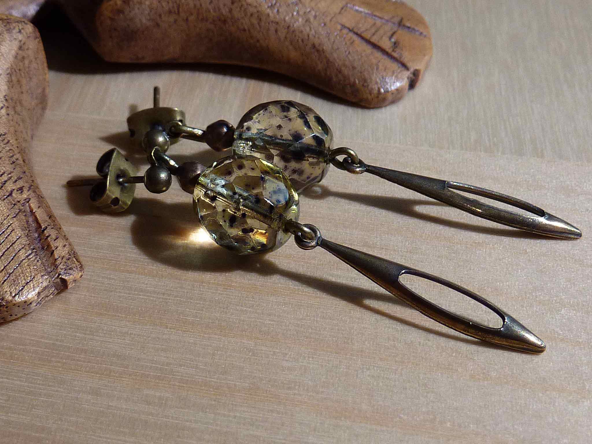 Description : Vintage cette boucle toute fine aux couleurs bronze avec sa perle facettée aux taches noires en cristal de bohème