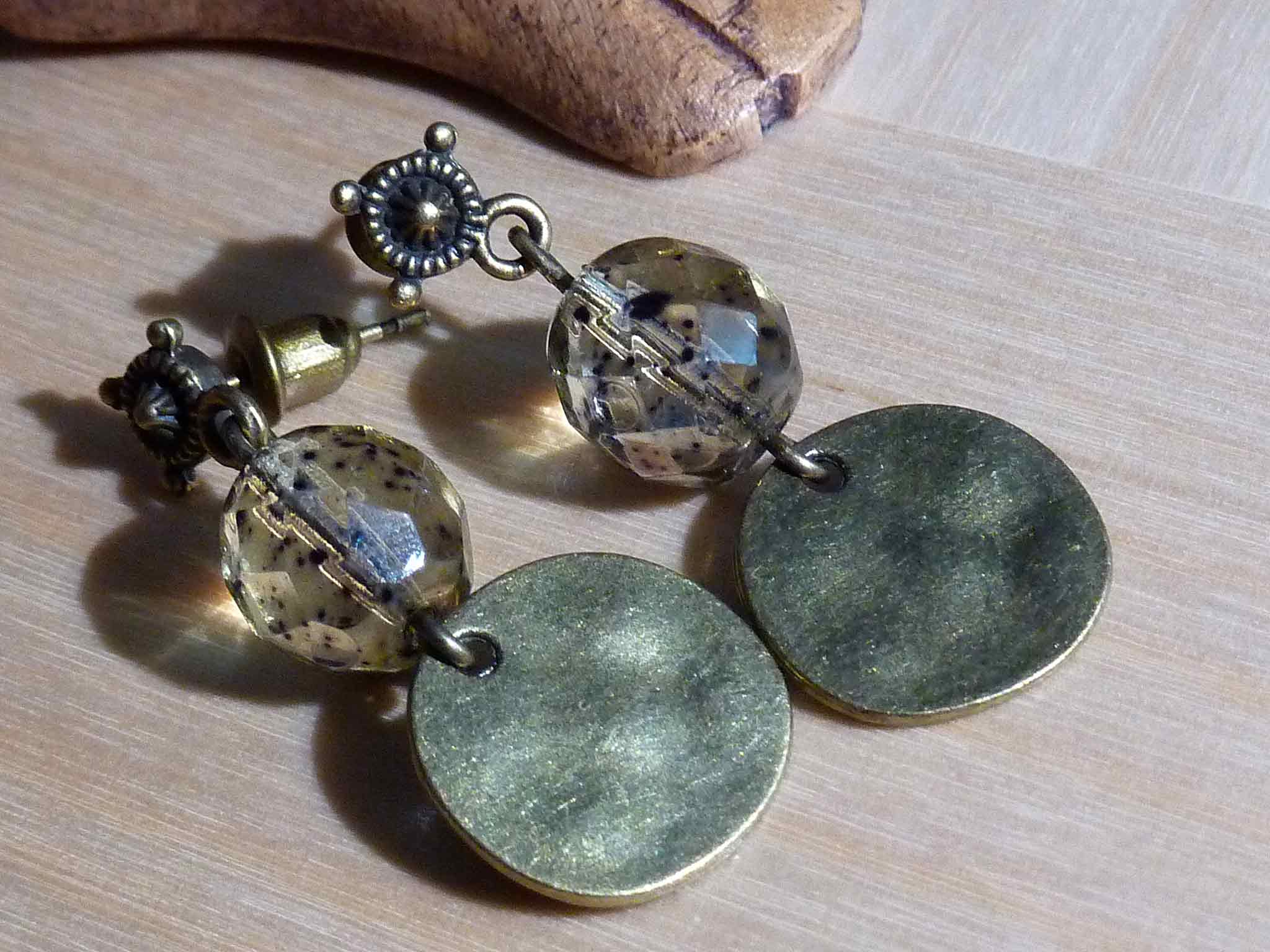 Description : Très vintage mais douce, cette boucle avec sa belle perle tachetée en verre de bohème et son sequin bronze