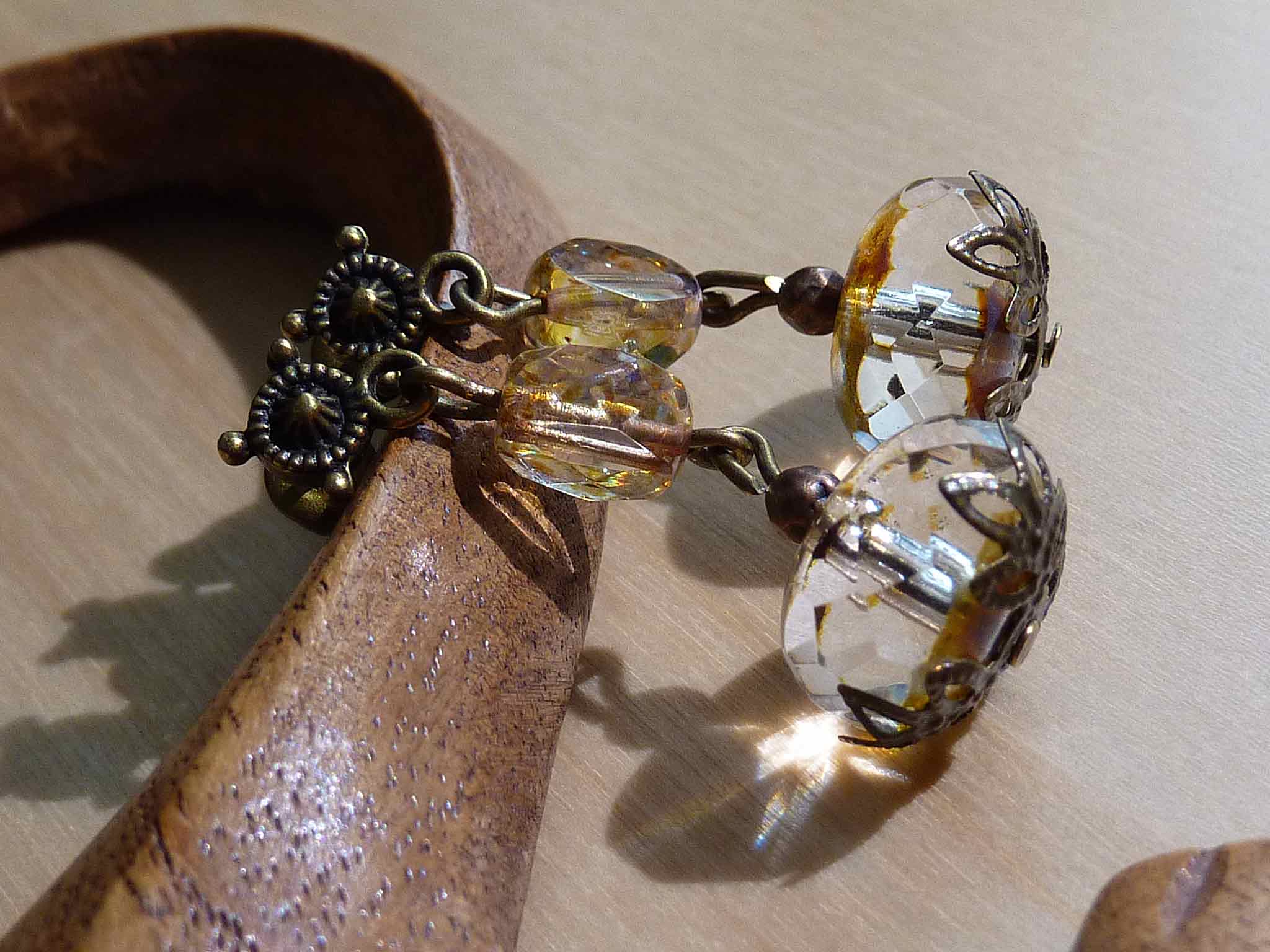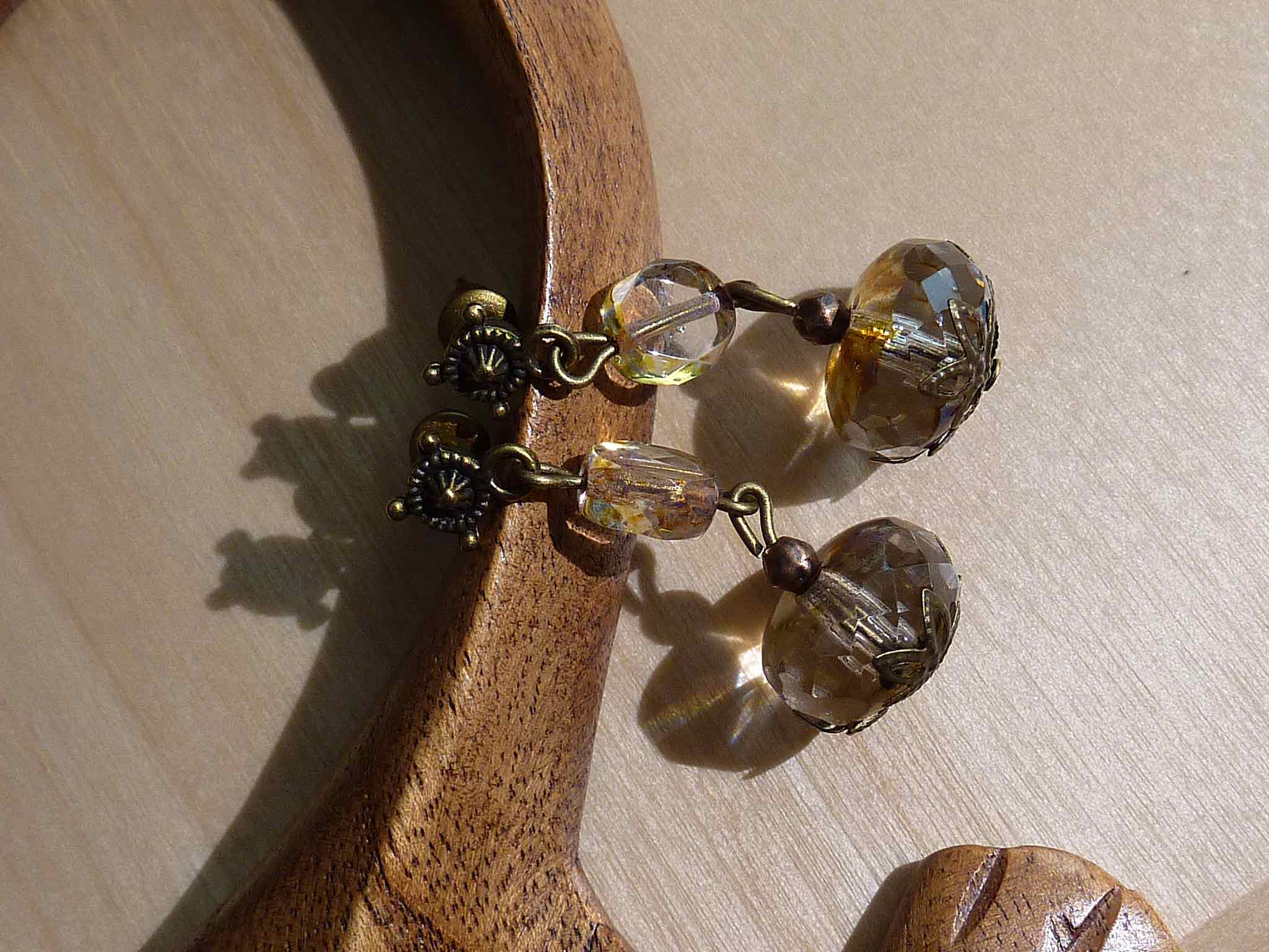 Description : Très chic cette jolie boucle dorée et mordorée avec ses perles en cristal de bohème et sa monture bronze.
