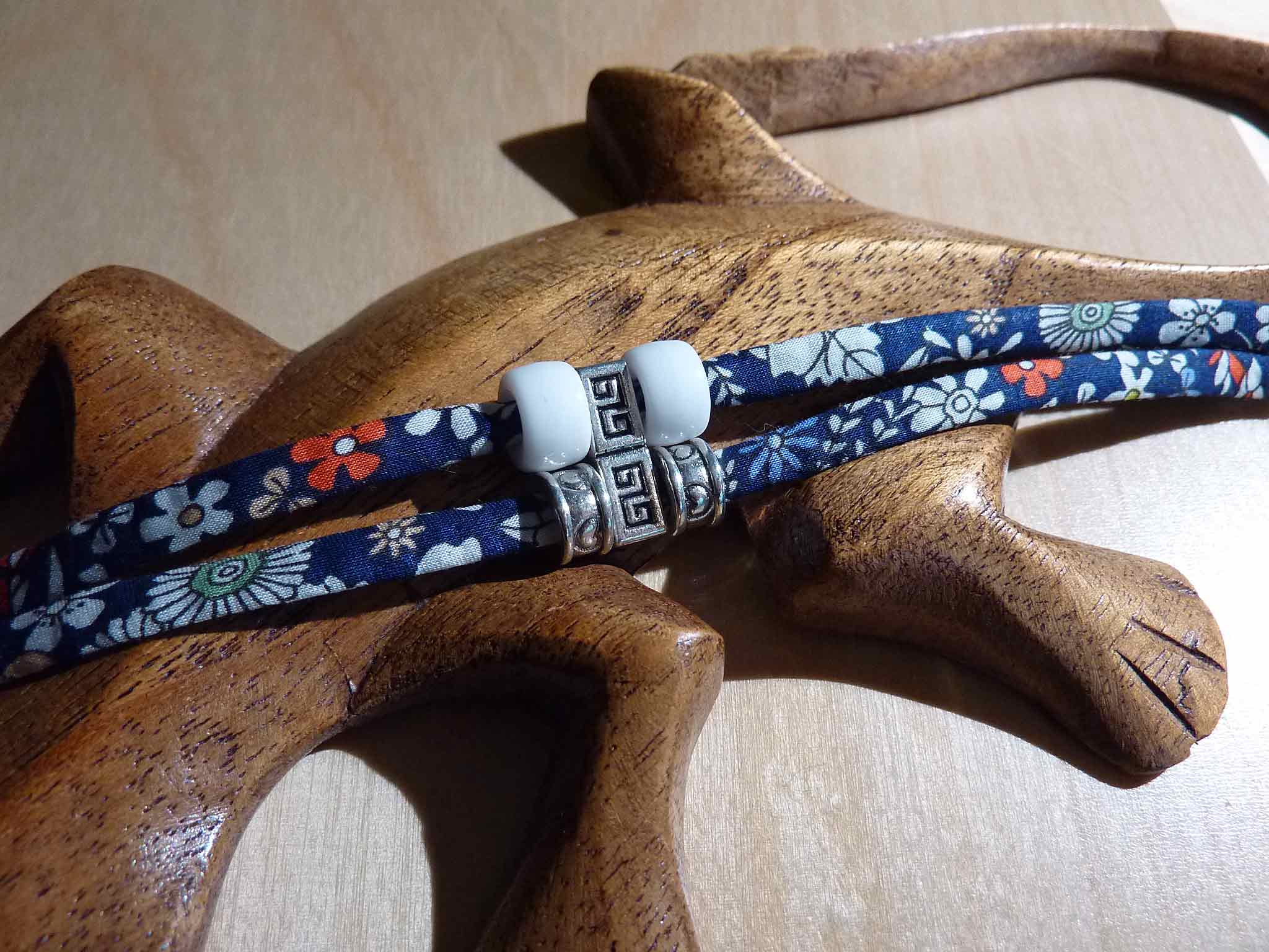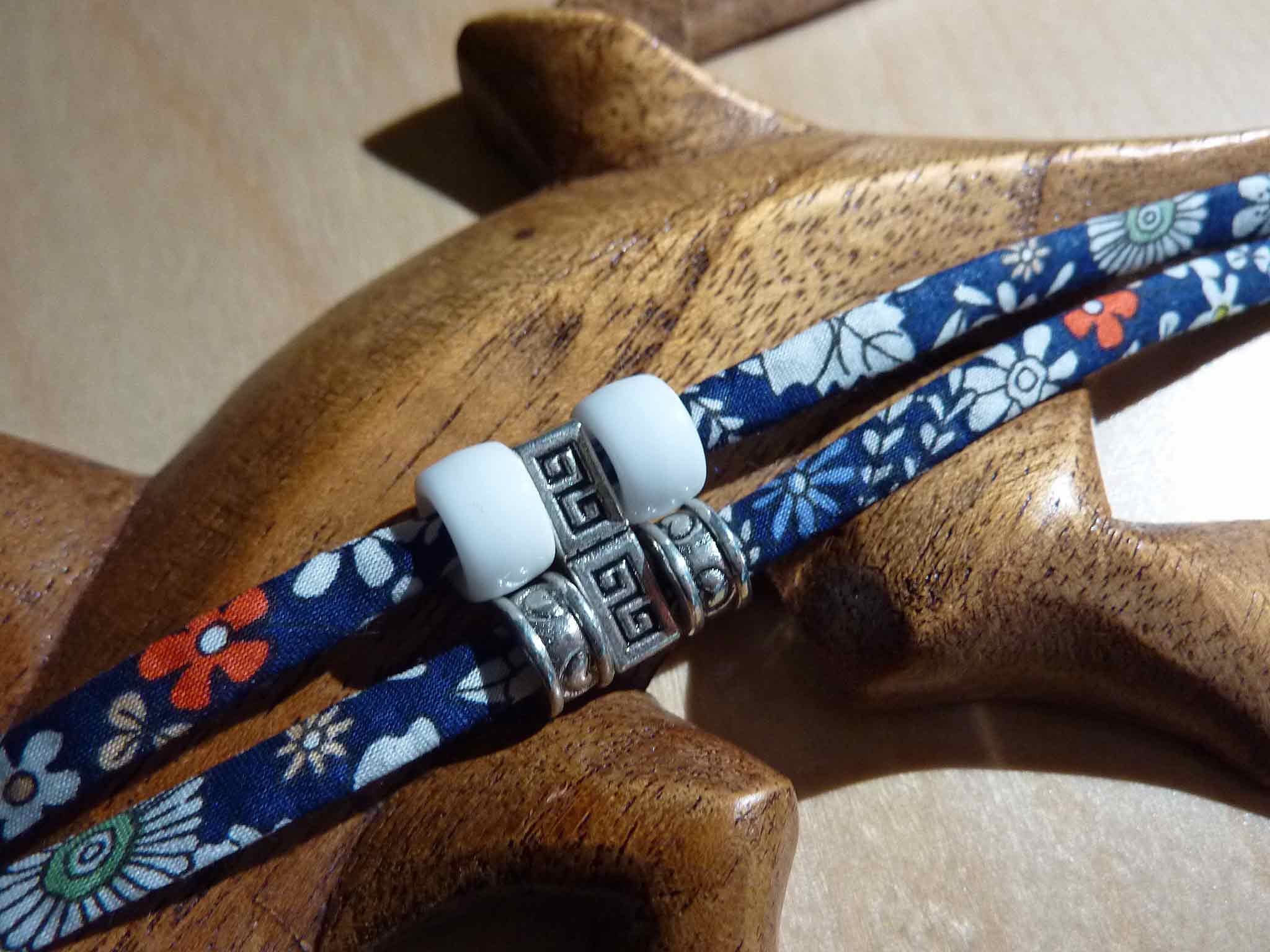 Description : 1 biais doublé marine fleuri avec des perles argentés et blanches. Fermoir aimanté.