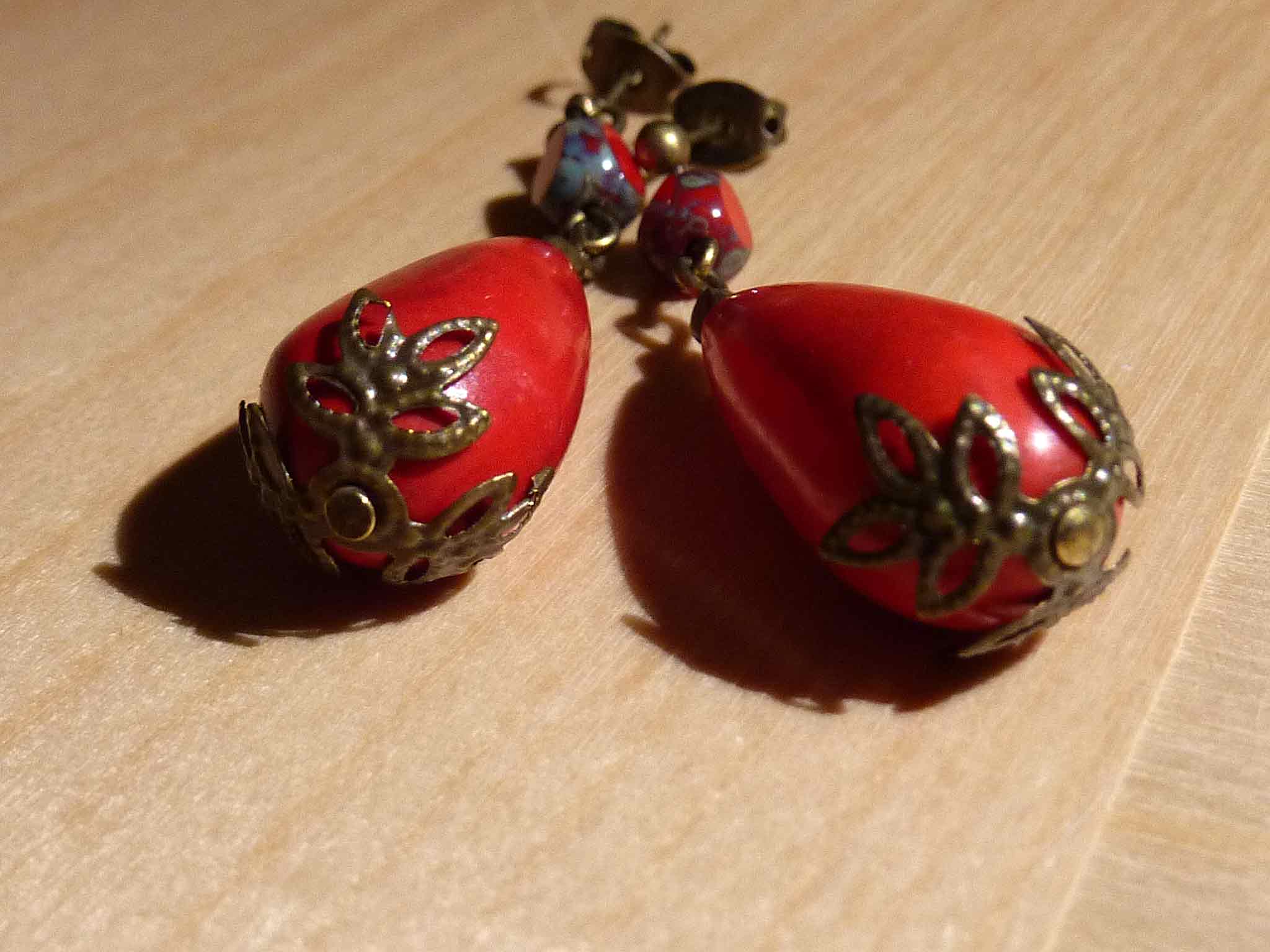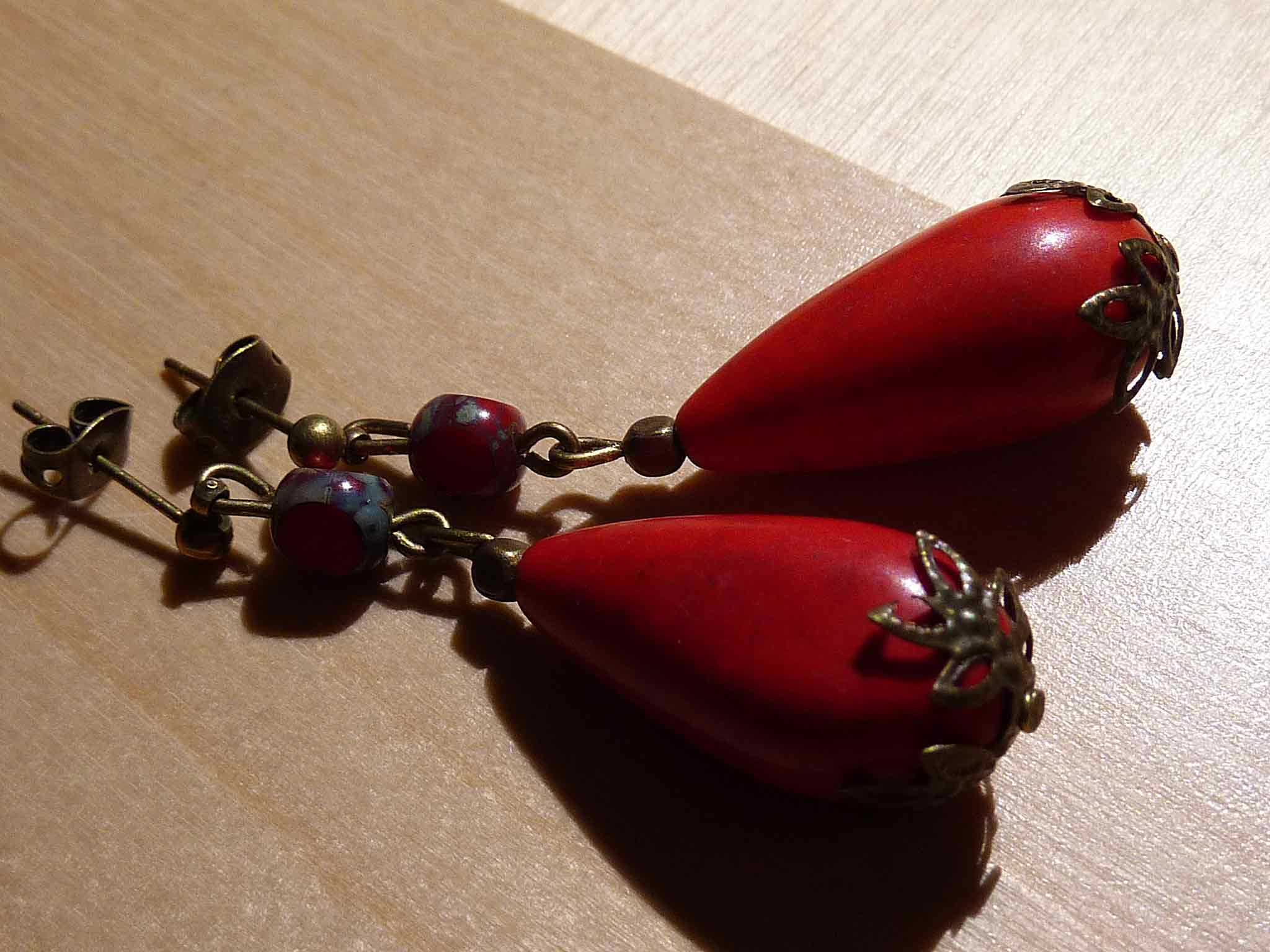 Description : Très vintage, cette longue goutte d'howlite rouge avec sa petite perle rouge et bronze en verre de bohème.