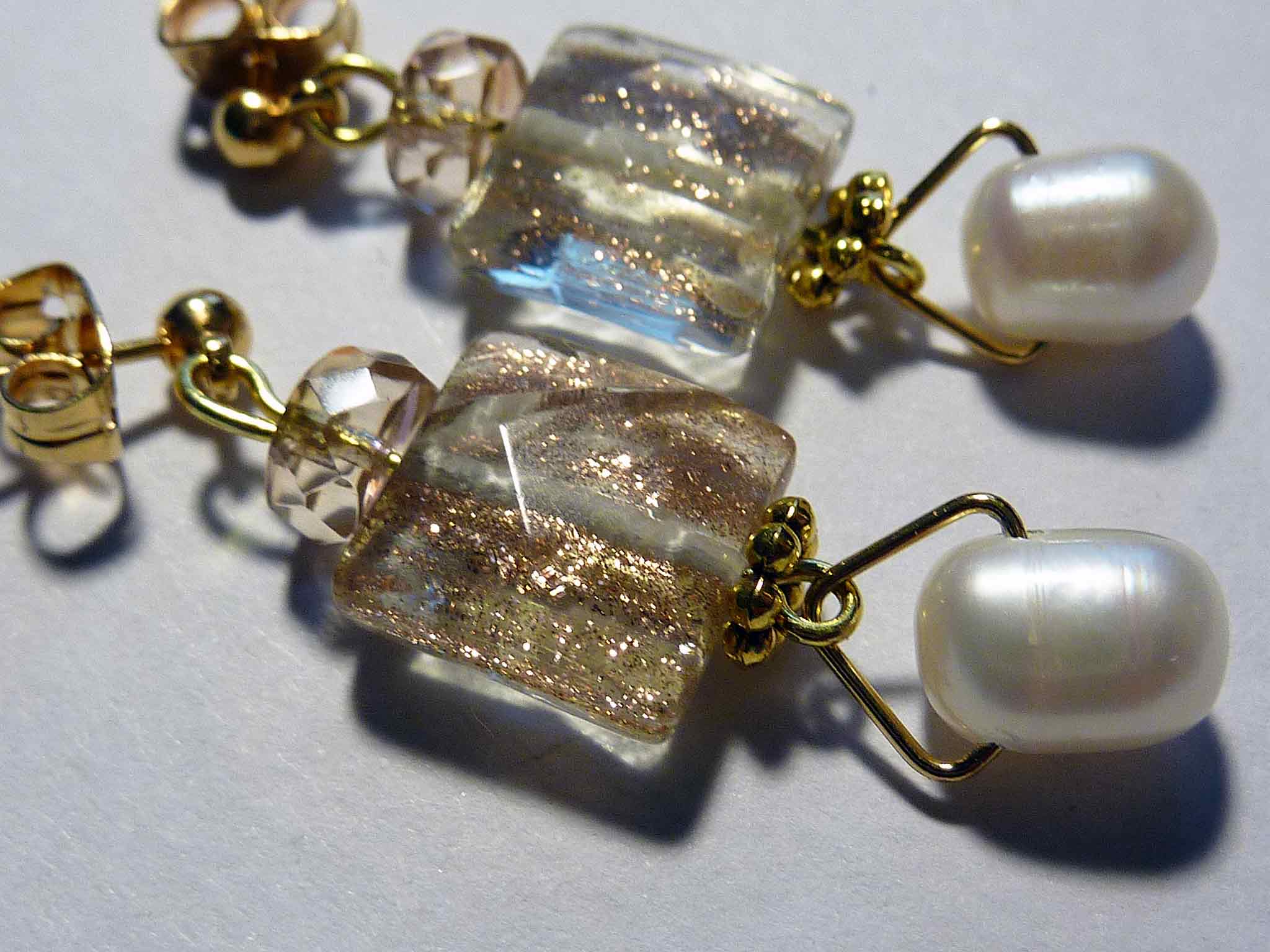 Description : Très lumineuse ! cette boucle toute dorée et ivoire. Elle est composée d'un palet en pierre de soleil et d'une petite perle de rivière