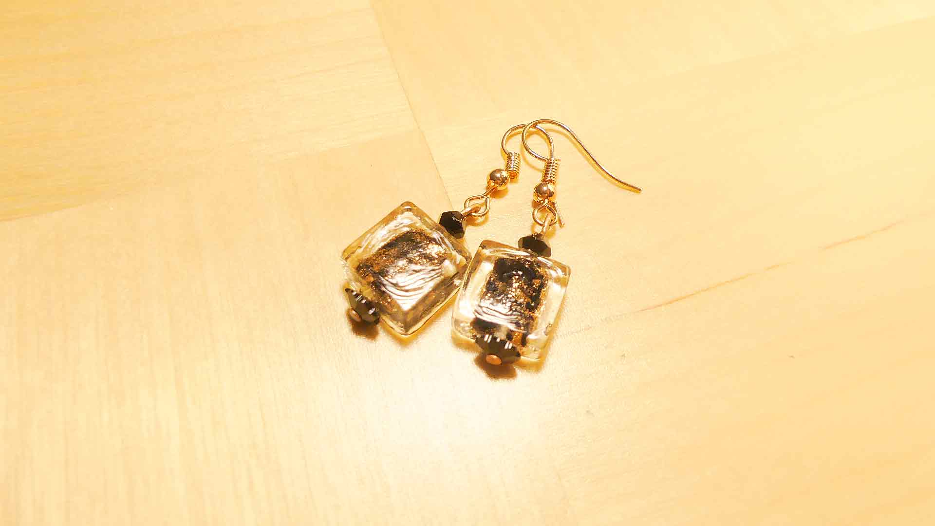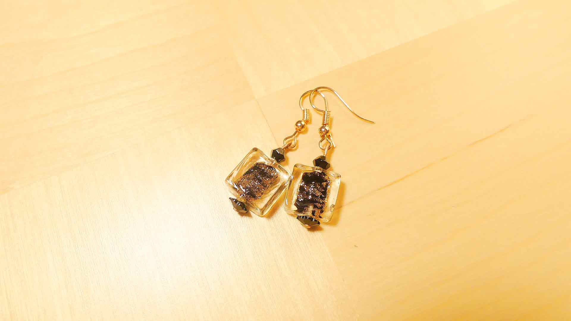 Description : Originale et simplissime cette boucle avec son palet style verre de murano noir et transparent aux reflets cuivrés