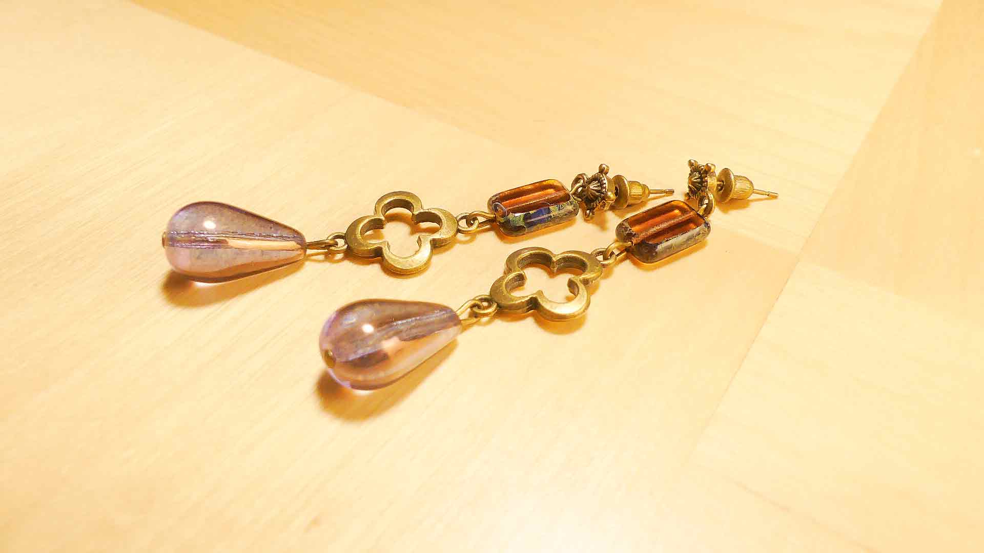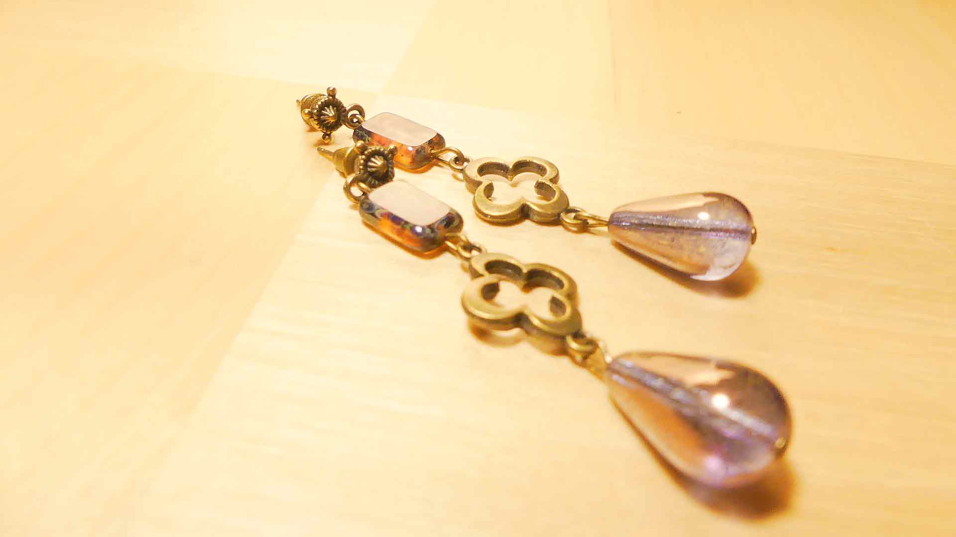 Description : En verre de bohème pour le palet violet et la goutte bleutée aux reflets roses, cette longue boucle fait très vintage avec sa monture bronze