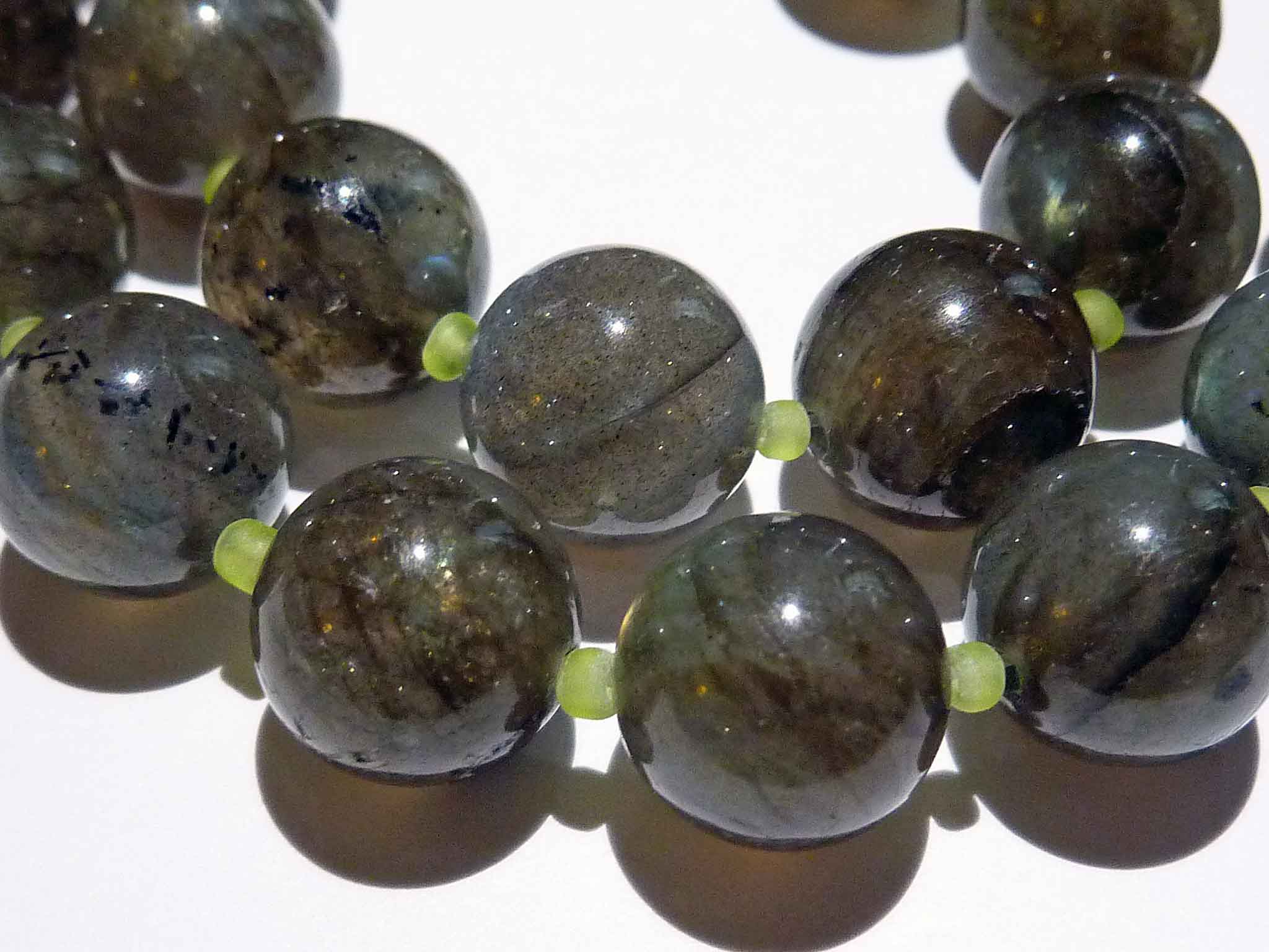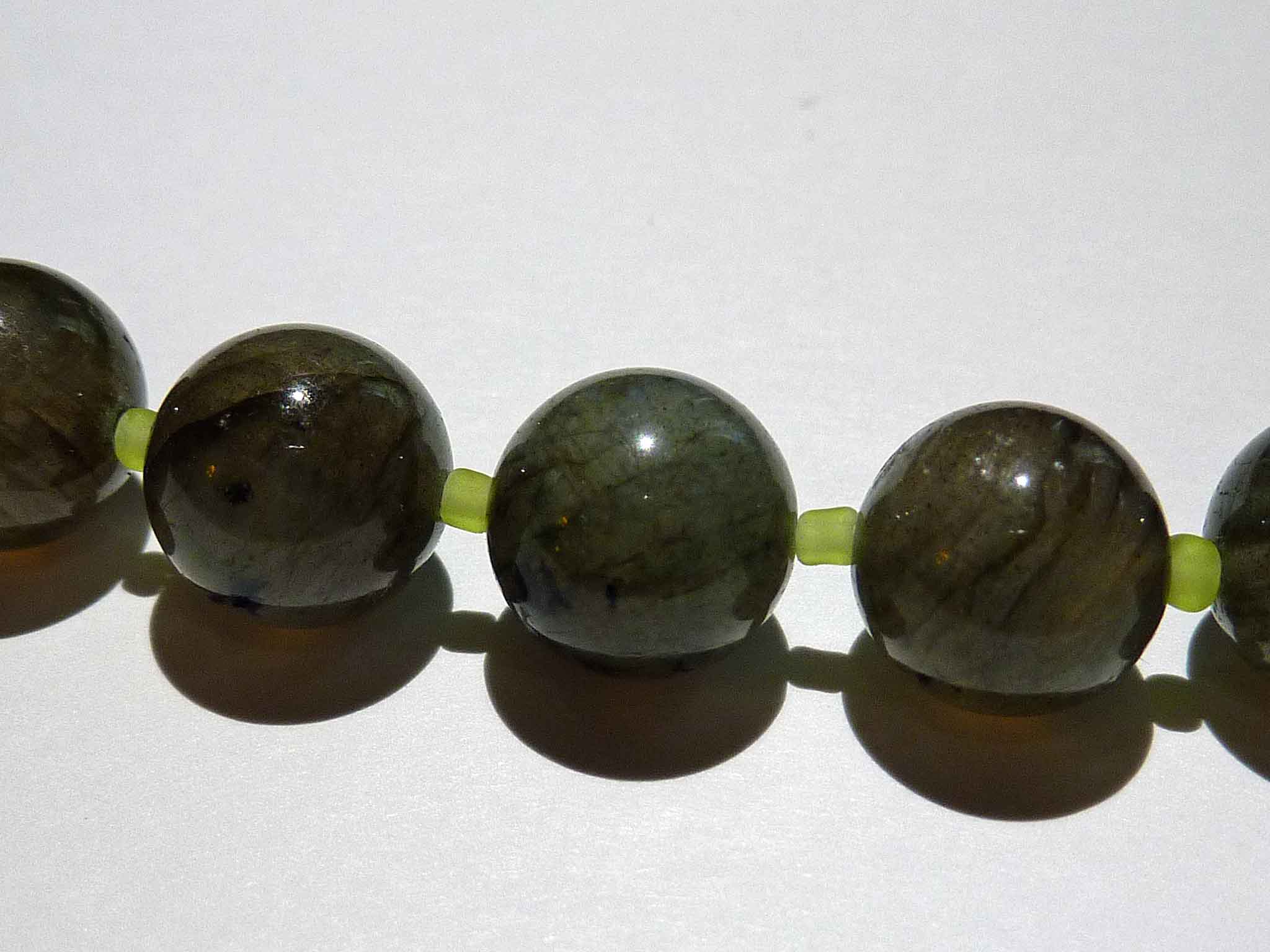 Description : Perles en labradorite aux teintes vertes à grises intercalées de petites perles de rocaille